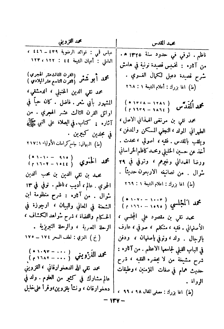 (ط) اغا بزرك: أعلام الشيعة 1: 268 محمد المقدس (1281 - 1358 هـ) (1864 - 1939 م) محمد تقي بن مرتضى الهمذاني الاصل، الطهراني المولد، النجفي المسكن والمدفن،