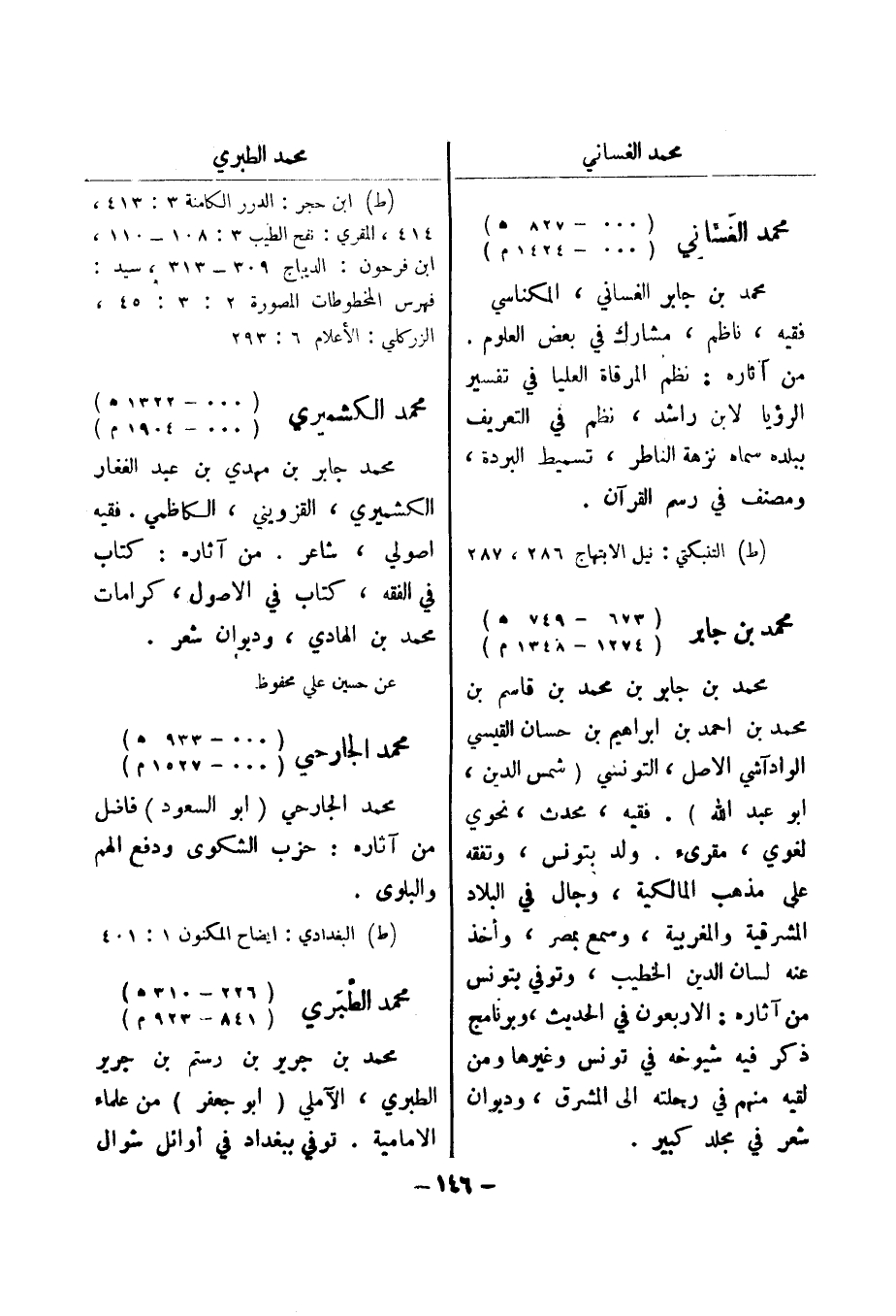 (ط) التنبكتي: نيل الابتهاج 286، 287 محمد بن جابر (673 - 749 هـ) (1274 - 1348 م) محمد بن جابر بن محمد بن قاسم بن محمد بن احمد بن ابراهيم بن حسان القيسي الوادآشي الاصل، التونسي (شمس الدين، أبو عبد الله) .