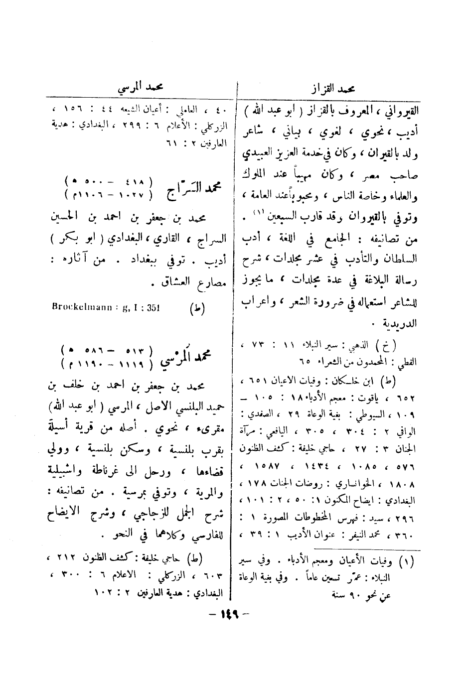 (ط) 351: Brockelmann: g , I محمد المرسي (513 - 586 هـ) (1119 - 1190 م) محمد بن جعفر بن احمد بن خلف بن حميد البلنسي الاصل، المرسي (أبو عبد الله) مقرئ، نحوي.