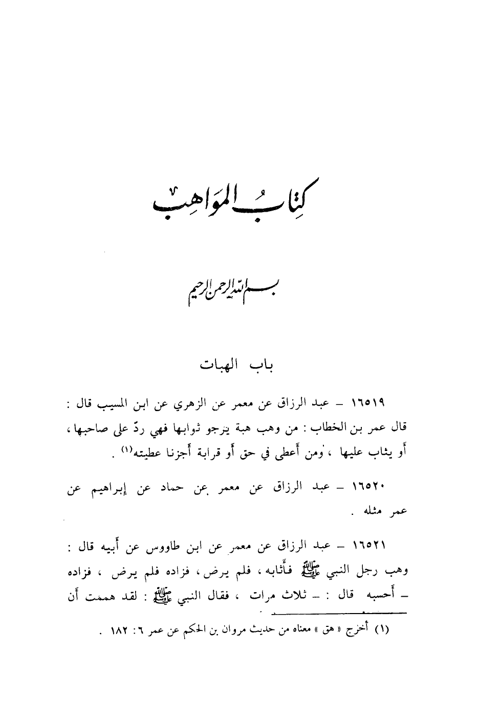 ١٦٥١٩ - عَنْ مَعْمَرٍ، عَنِ الزُّهْرِيِّ، عَنِ ابْنِ الْمُسَيِّبِ قَالَ: قَالَ: عُمَرُ بْنُ الْخَطَّابِ: «مَنْ وَهَبَ هِبَةً يَرْجُو ثَوَابَهَا فَهِيَ رَدٌّ عَلَى صَاحِبِهَا أَوْ يُثَابُ عَلَيْهَا، وَمَنْ أَعْطَى فِي حَقٍّ أَوْ قَرَابَةٍ أَجَزْنَا عَطِيَّتَهُ»، عَبْدُ الرَّزَّاقِ،