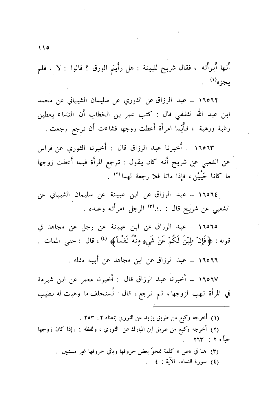 ١٦٥٦٥ - عَنِ ابْنِ عُيَيْنَةَ، عَنْ رَجُلٍ، عَنْ مُجَاهِدٍ فِي قَوْلِهِ {فَإِنْ طِبْنَ لَكُمْ عَنْ شَيْءٍ مِنْهُ نَفْسًا} [النساء: ٤] قَالَ: «حَتَّى الْمَمَاتِ»، عَبْدُ الرَّزَّاقِ،