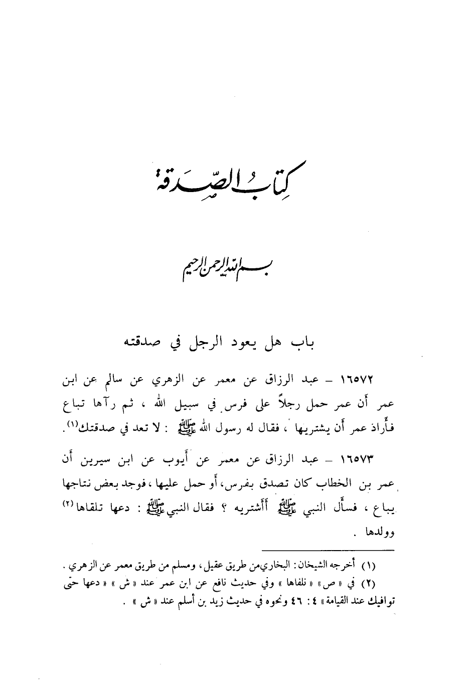 ١٦٥٧٢ - عَنْ مَعْمَرٍ، عَنِ الزُّهْرِيِّ، عَنْ سَالِمٍ، عَنِ ابْنِ عُمَرَ، أَنَّ عُمَرَ حَمَلَ رَجُلًا عَلَى فَرَسٍ فِي سَبِيلِ اللَّهِ ثُمَّ رَآهَا تُبَاعُ، فَأَرَادَ عُمَرُ أَنْ يَشْتَرِيهَا فَقَالَ لَهُ رَسُولُ اللَّهِ صَلَّى اللهُ عَلَيْهِ وَسَلَّمَ: «لَا تَعُدْ فِي صَدَقَتِكَ»