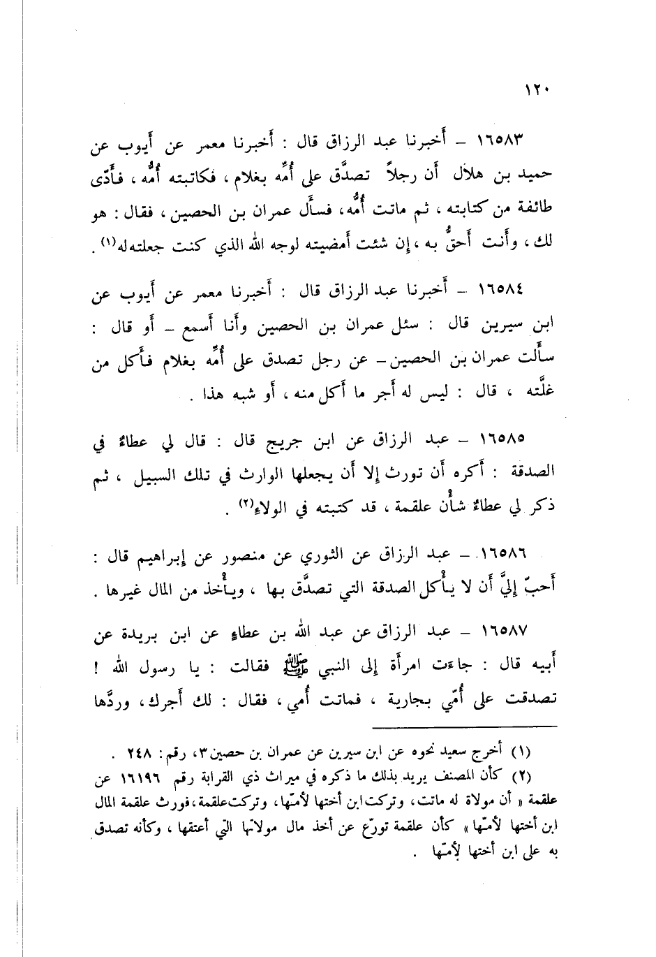 ١٦٥٨٤ - عَبْدُ الرَّزَّاقِ قَالَ: أَخْبَرَنَا مَعْمَرٌ، عَنْ أَيُّوبَ، عَنِ ابْنِ سِيرِينَ قَالَ: سُئِلَ عِمْرَانُ بْنُ الْحُصَيْنِ وَأَنَا أَسْمَعُ أَوْ قَالَ: سَأَلْتُ عِمْرَانَ بْنَ الْحُصَيْنِ عَنْ رَجُلٍ تَصَدَّقَ عَلَى أُمِّهِ بِغُلَامٍ فَأَكَلَ مِنْ غَلَّتِهِ قَالَ: «لَيْسَ لَهُ أَجْرٌ مَا أَكَلَ مِنْهُ أَوْ شِبْهَ هَذَا»
