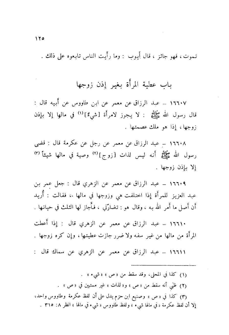 ١٦٦٠٧ - عَنْ مَعْمَرٍ، عَنِ ابْنِ طَاوُسٍ، عَنْ أَبِيهِ قَالَ: قَالَ رَسُولُ اللَّهِ صَلَّى اللهُ عَلَيْهِ وَسَلَّمَ: «لَا يَجُوزُ لِامْرَأَةٍ شَيْءٌ فِي مَالِهَا إِلَّا بِإِذْنِ زَوْجِهَا إِذَا هُوَ مَلَكَ عِصْمَتِهَا»