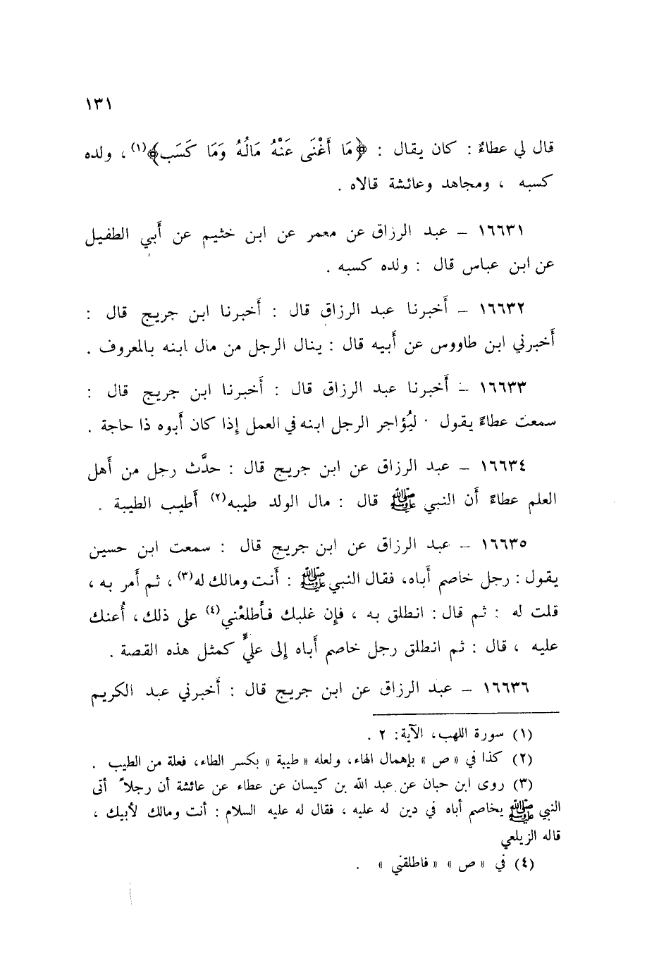 ١٦٦٣٢ - عَبْدُ الرَّزَّاقِ قَالَ: أَخْبَرَنَا ابْنُ جُرَيْجٍ قَالَ: أَخْبَرَنِي ابْنُ طَاوُسٍ، عَنْ أَبِيهِ قَالَ: «يَنَالُ الرَّجُلُ مِنْ مَالِ ابْنِهِ بِالْمَعْرُوفِ»