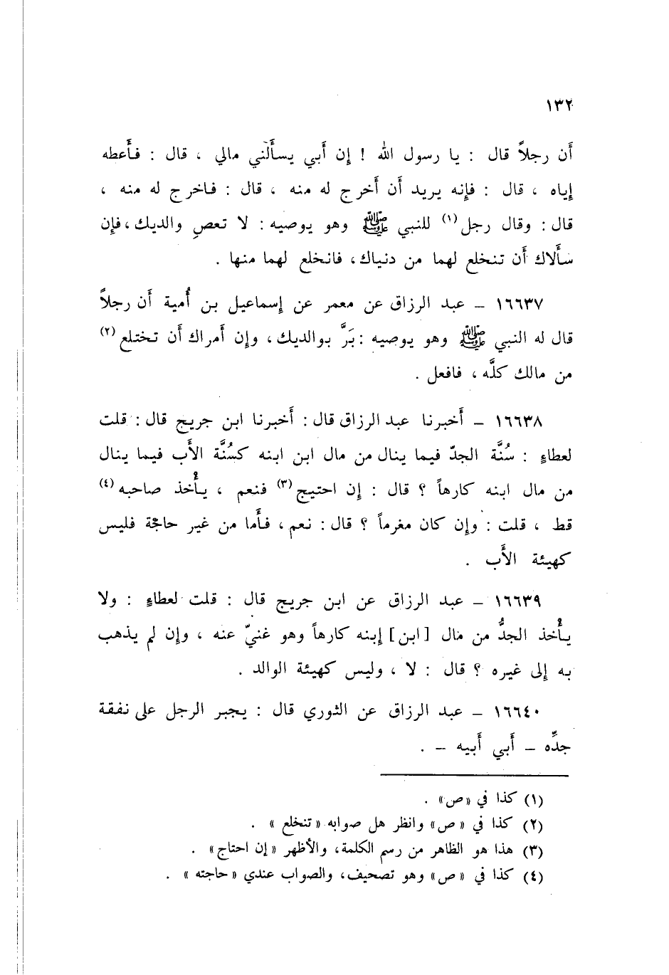 ١٦٦٣٨ - عَبْدُ الرَّزَّاقِ قَالَ: أَخْبَرَنَا ابْنُ جُرَيْجٍ قَالَ: قُلْتُ لِعَطَاءٍ: سُنَّةُ الْجَدِّ فِيمَا يَنَالُ مِنْ مَالِ ابْنِ ابْنِهِ كَسُنَّةِ الَابِ فِيمَا يَنَالُ مِنْ مَالِ ابْنِهِ كَارِهًا قَالَ: «إنِ احْتِيجَ فَنَعَمْ يَأْخُذُ صَاحِبُهُ قَطُّ» قُلْتُ: وَإِنْ كَانَ مُغْرَمًا؟ قَالَ: «نَعَمْ فَأَمَّا مِنْ غَيْرِ حَاجَةٍ فَلَيْسَ كَهَيْئَةِ الَأبِ»