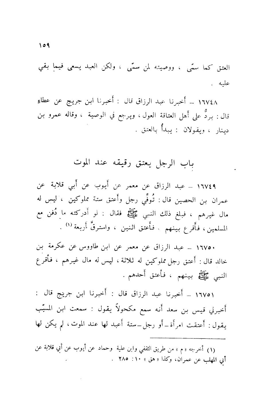 ١٦٧٤٩ - عَنْ مَعْمَرٍ، عَنْ أَيُّوبَ، عَنْ أَبِي قِلَابَةَ، عَنْ عِمْرَانَ بْنِ الْحُصَيْنِ قَالَ: تُوُفِّي رَجُلٌ وَأَعْتَقَ سِتَّةَ مَمْلُوكِينَ لَيْسَ لَهُ مَالٌ غَيْرُهُمْ فَبَلَغَ ذَلِكَ النَّبِيَّ صَلَّى اللهُ عَلَيْهِ وَسَلَّمَ، فَقَالَ: «لَوْ أَدْرَكْتُهُ مَا دُفِنَ مَعَ الْمُسْلِمِينَ، فَأَقْرَعَ بَيْنَهُمْ، فَأَعْتَقَ اثْنَيْنِ وَاسْتَرَقَّ أَرْبَعَةً»
