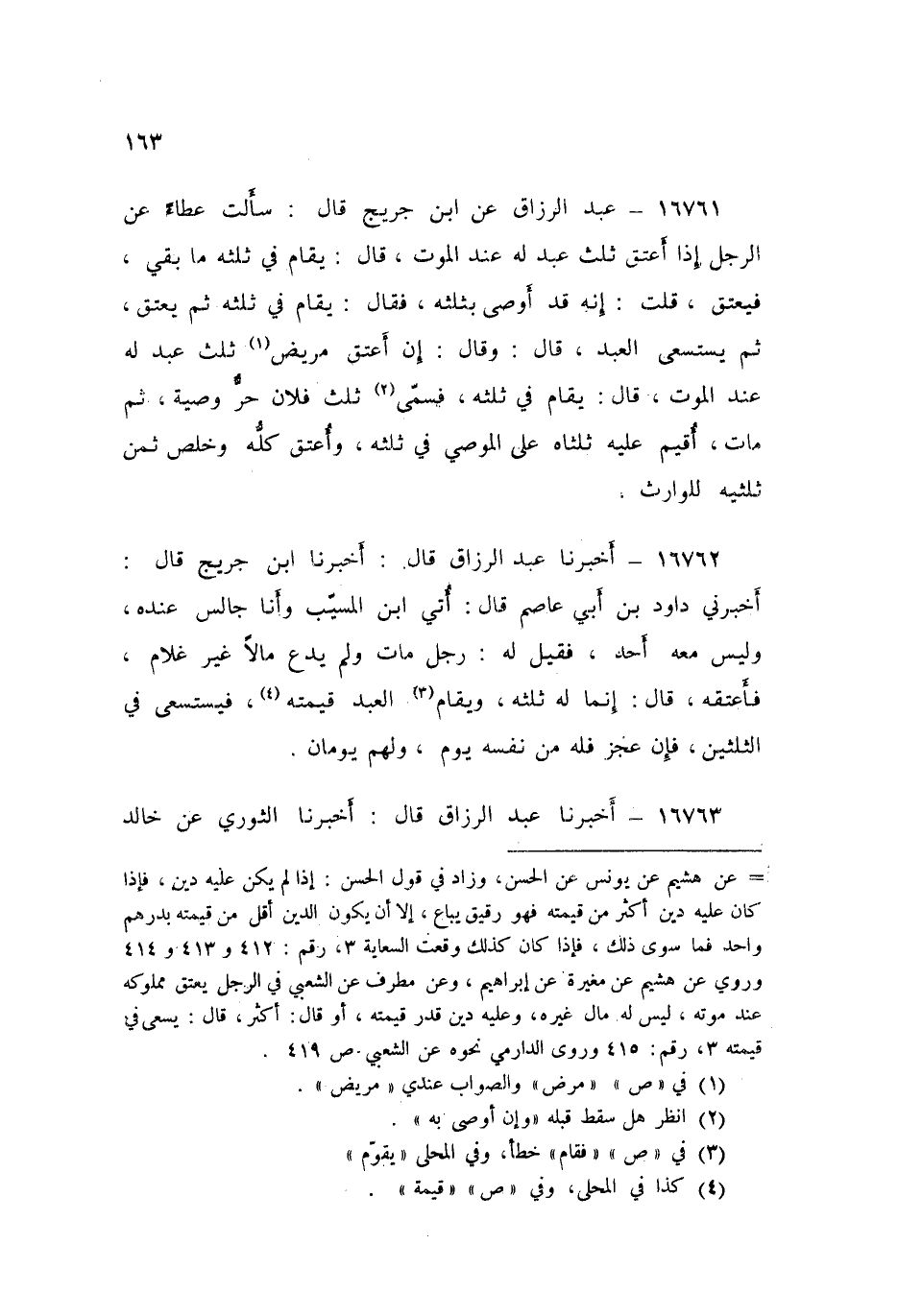 ١٦٧٦٣ - عَبْدُ الرَّزَّاقِ قَالَ: أَخْبَرَنَا الثَّوْرِيُّ: عَنِ خَالِدٍ الْحَذَّاءِ، عَنِ الْحَسَنِ، عَنْ عِمْرَانَ بْنِ الْحُصَيْنِ قَالَ: «أَعْتَقَ رَجُلٌ سِتَّةَ مَمْلُوكَينَ لَهُ عِنْدَ مَوْتِهِ فَأَقْرَعَ النَّبِيُّ صَلَّى اللهُ عَلَيْهِ وَسَلَّمَ بَيْنَهُمْ، فَأَعْتَقَ اثْنَيْنِ مِنْهُمْ»