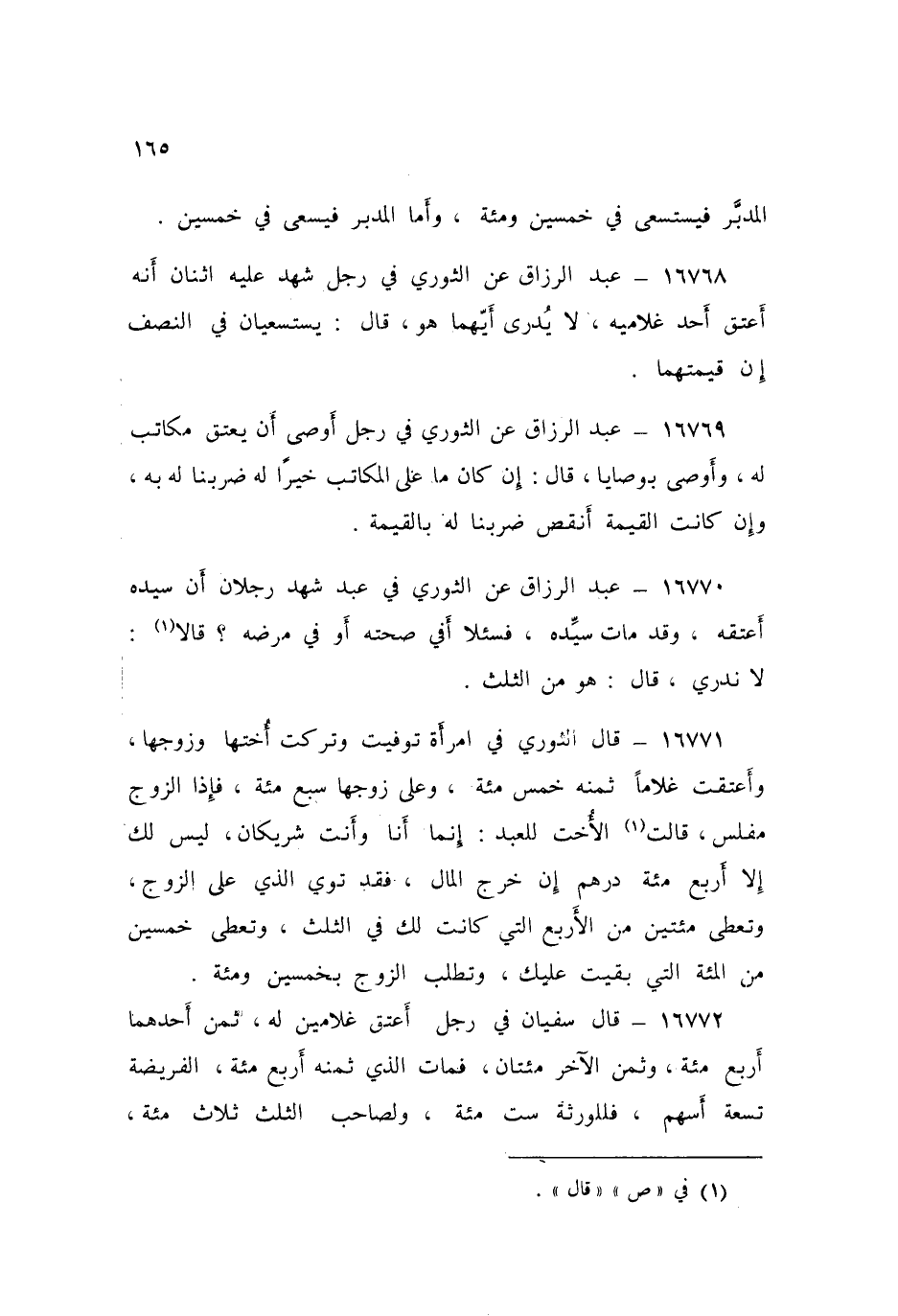 ١٦٧٧١ - قَالَ: الثَّوْرِيُّ: فِي " امْرَأَةٍ تُوُفِّيَتْ وَتَرَكَتْ أُخْتَهَا وَزَوْجَهَا، وَأَعْتَقَتْ غُلَامًا ثَمَنُهُ خَمْسُمِائَةٍ، وَعَلَى زَوْجِهَا سَبْعُمِائَةٍ فَإِذَا الزَّوْجُ مُفْلِسٌ قَالَتِ الْأُخْتُ لِلْعَبْدِ: إِنَّمَا أَنَا وَأَنْتَ شَرِيكَانِ لَيْسَ لَكَ إِلَّا أَرْبَعُمِائَةِ دِرْهَمٍ إِنْ خَرَجَ الْمَالُ فَقَدْ تَوِيَ الَّذِي عَلَى الزَّوْجِ وَتُعْطِي مِائَتَيْنِ مِنَ الْأَرْبَعِ الَّتِي كَانَتْ لَكَ فِي الثُّلُثِ، وَتُعْطِي خَمْسِينَ مِنَ الْمِائَةِ الَّتِي بَقِيَتْ عَلَيْكَ، وَتَطْلُبُ الزَّوْجَ بِخَمْسِينَ وَمِائَةٍ "