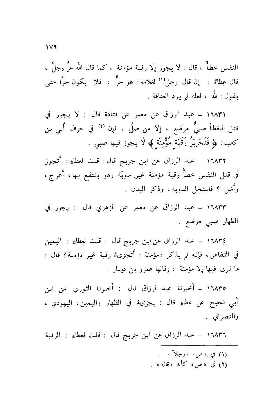 ١٦٨٣٦ - عَنِ ابْنِ جُرَيْجٍ قَالَ: قُلْتُ لِعَطَاءٍ: الرَّقَبَةُ الْمُؤْمِنَةُ أَيَجُوزُ فِيهَا صَبِيٌّ؟ قَالَ: «نَعَمْ» قُلْتُ: فَكَيْفَ وَلَمْ يُصَلِّ وَلَمْ أَدْرِ مُسْلِمٌ هُوَ أَمْ لَا؟ فَقَالَ: ذَلِكَ فَرَاجَعْتُهُ بَعْدَ أَيَّامٍ فِيهِ فَقَالَ: «مَا أُرَاهُ إِلَّا مُسْلِمًا» قَالَ: وَقَالَ: عَمْرُو بْنُ دِينَارٍ: مَا أُرَاهُ إِلَّا الَّذِي قَدْ بَلَغَ وَأَسْلَمَ، قُلْتُ لِعَطَاءٍ: وَإِنَّ الَّذِي بَلَغَ دِينُهُ دِينُ مُسْلِمٍ؟ قَالَ: «أَجَلْ وَيُصَلَّى عَلَيْهِ»، قُلْتُ لِعَطَاءٍ: فَسُبِي أَعْجَمًا لَمْ يَبْلُغِ الْحَنَثَ قَالَ: «مَنْ وُلِدَ هَاهُنَا أَحَبُّ إِلَيْهِ وَلَعَلَّهُ أَنْ يَقْضِيَ»