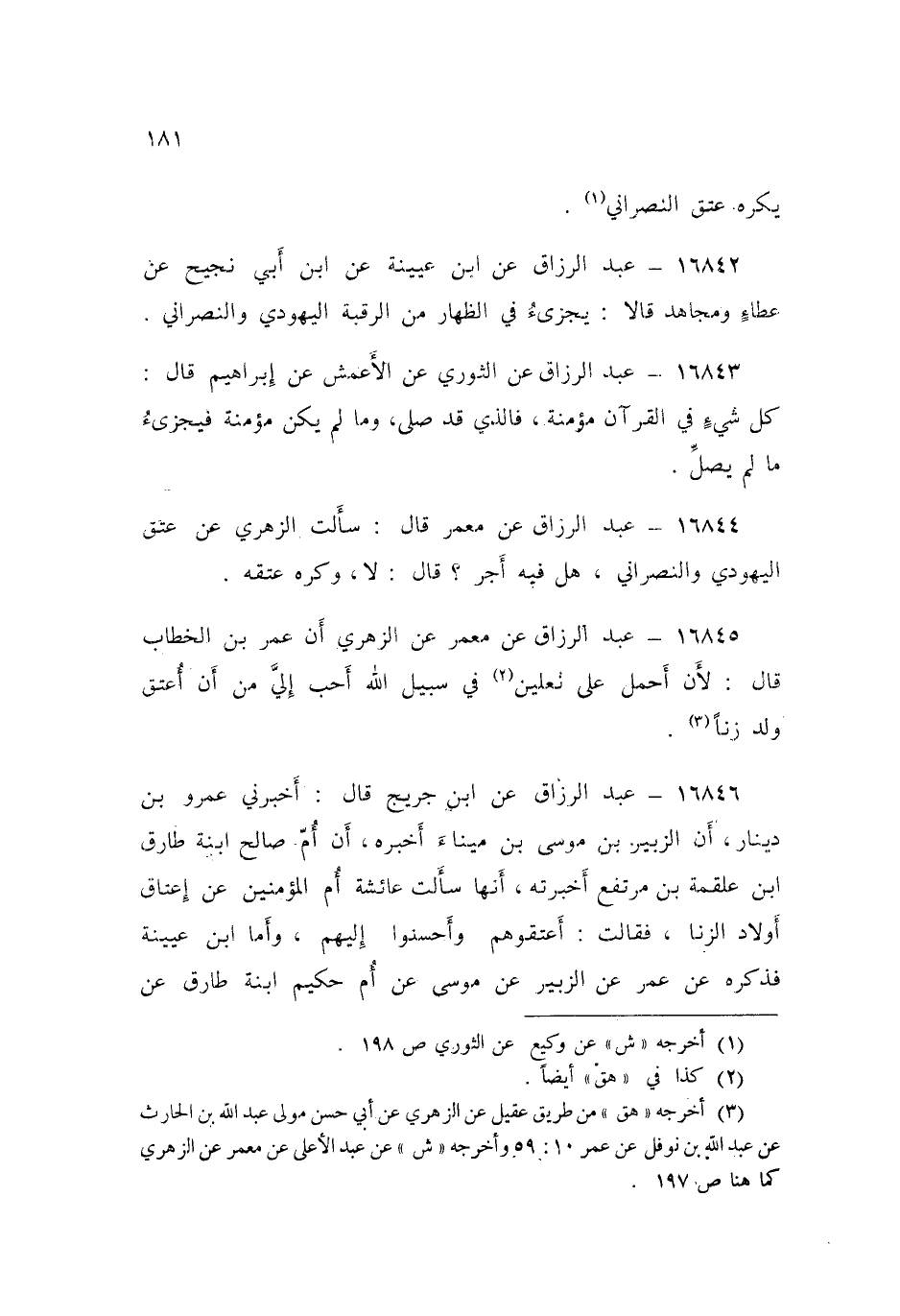 ١٦٨٤٤ - عَنْ مَعْمَرٍ قَالَ: سَأَلْتُ الزُّهْرِيَّ عَنْ عِتْقِ الْيَهُودِيِّ، وَالنَّصْرَانِيِّ هَلْ فِيهِ أَجْرٌ؟ قَالَ: «لَا وَكَرِهَ عِتْقَهُ»