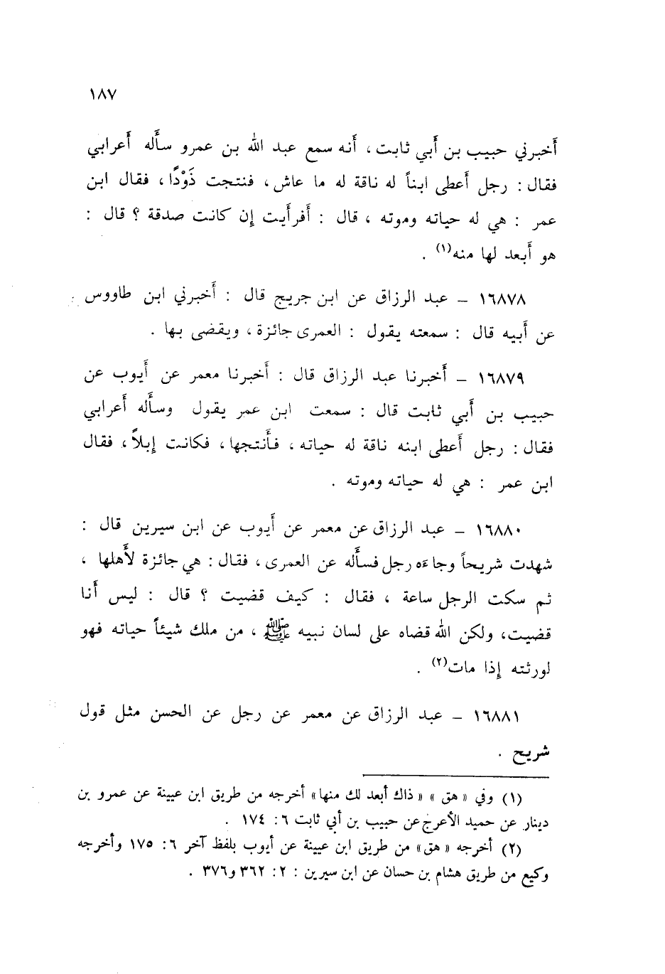 ١٦٨٧٩ - عَبْدُ الرَّزَّاقِ قَالَ: أَخْبَرَنَا مَعْمَرٌ، عَنْ أَيُّوبَ، عَنْ حَبِيبِ بْنِ أَبِي ثَابِتٍ قَالَ: سَمِعْتُ ابْنَ عُمَرَ يَقُولُ: وَسَأَلَهُ أَعْرَابِيٌّ فَقَالَ: رَجُلٌ أَعْطَى ابْنَهُ نَاقَةً لَهُ حَيَاتَهُ فَأَنْتَجَهَا فَكَانَتْ إِبَلًا، فَقَالَ ابْنُ عُمَرَ: «هِيَ لَهُ حَيَاتَهُ وَمَوْتَهُ»