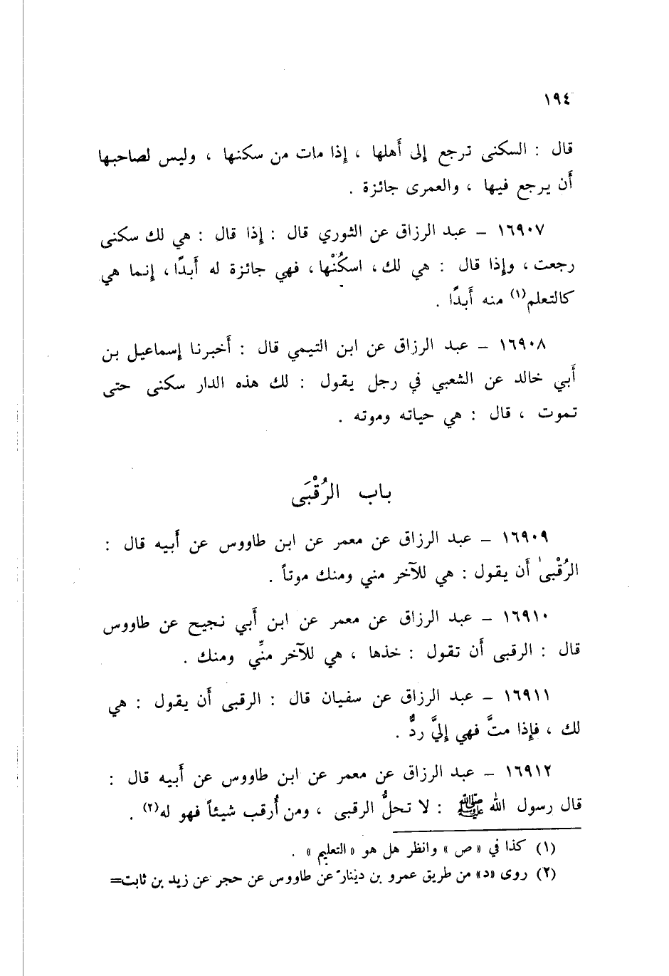 ١٦٩١٢ - عَنْ مَعْمَرٍ، عَنِ ابْنِ طَاوُسٍ، عَنْ أَبِيهِ قَالَ: قَالَ رَسُولُ اللَّهِ صَلَّى اللهُ عَلَيْهِ وَسَلَّمَ: «لَا تَحِلُّ الرُّقْبَى، وَمَنْ أُرْقِبَ شَيْئًا فَهُوَ لَهُ»