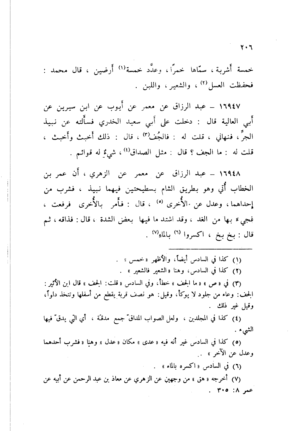 ١٦٩٤٨ - عَبْدُ الرَّزَّاقِ، عَنْ مَعْمَرٍ، عَنِ الزُّهْرِيِّ، أَنَّ عُمَرَ بْنَ الْخَطَّابِ، أُتِيَ وَهُوَ بِطَرِيقِ الشَّامِ بِسَطِيحَتَيْنِ فِيهِمَا نَبِيذٌ فَشَرِبَ مِنْ إِحْدَاهُمَا وَعَدَلَ عَنِ الْأُخْرَى قَالَ: «فَأَمَرَ بِالْأُخْرَى فَرُفِعَتْ فَجِيءَ بِهَا مِنَ الْغَدِ، وَقَدِ اشْتَدَّ مَا فِيهَا بَعْضَ الشِّدَّةِ» قَالَ: «فَذَاقَهُ» ثُمَّ قَالَ: «بَخٍ بَخٍ اكْسِرُوا بِالْمَاءِ»