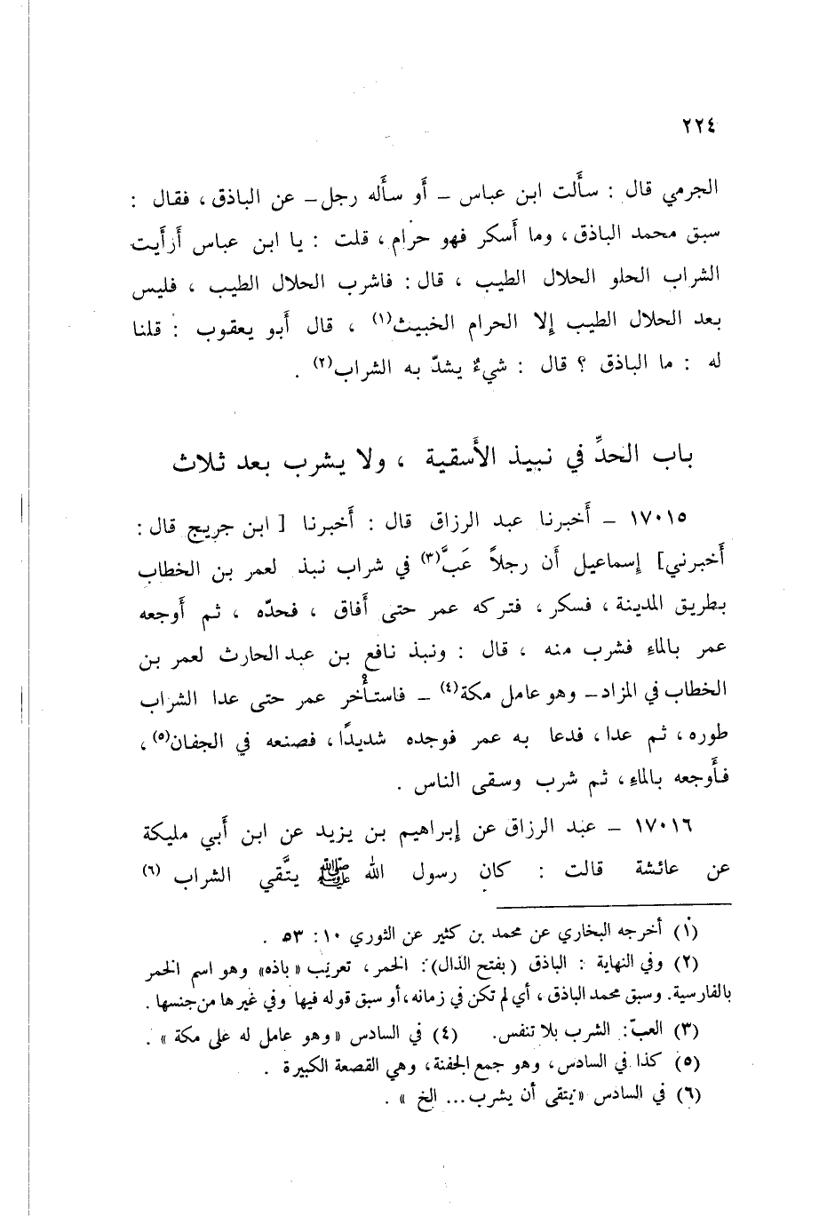 ١٧٠١٥ - عَبْدُ الرَّزَّاقِ قَالَ: أَخْبَرَنَا ابْنُ جُرَيْجٍ قَالَ: أَخْبَرَنِي إِسْمَاعِيلُ، " أَنَّ رَجُلًا عَبَّ فِي شَرَابٍ نُبِذَ لِعُمَرَ بْنِ الْخَطَّابِ بِطَرِيقِ الْمَدِينَةِ فَسَكِرَ فَتَرَكَهُ عُمَرُ حَتَّى أَفَاقَ فَحَدَّهُ، ثُمَّ أَوْجَعَهُ عُمَرُ بِالْمَاءِ فَشَرِبَ مِنْهُ قَالَ: وَنَبَذَ نَافِعُ بْنُ عَبْدِ الْحَارِثِ لِعُمَرَ بْنِ الْخَطَّابِ فِي الْمَزَادِ وَهُوَ عَامِلُ مَكَّةَ فَاسْتَأْخَرَ عُمَرُ حَتَّى عَدَا الشَّرَابُ طَوْرَهُ، ثُمَّ عَدَا فَدَعَا بِهِ عُمَرُ فَوَجَدَهُ شَدِيدًا فَصَنَعَهُ فِي الْجِفَانِ، فَأَوْجَعَهُ بِالْمَاءِ، ثُمَّ شَرِبَ وَسَقَى النَّاسَ "