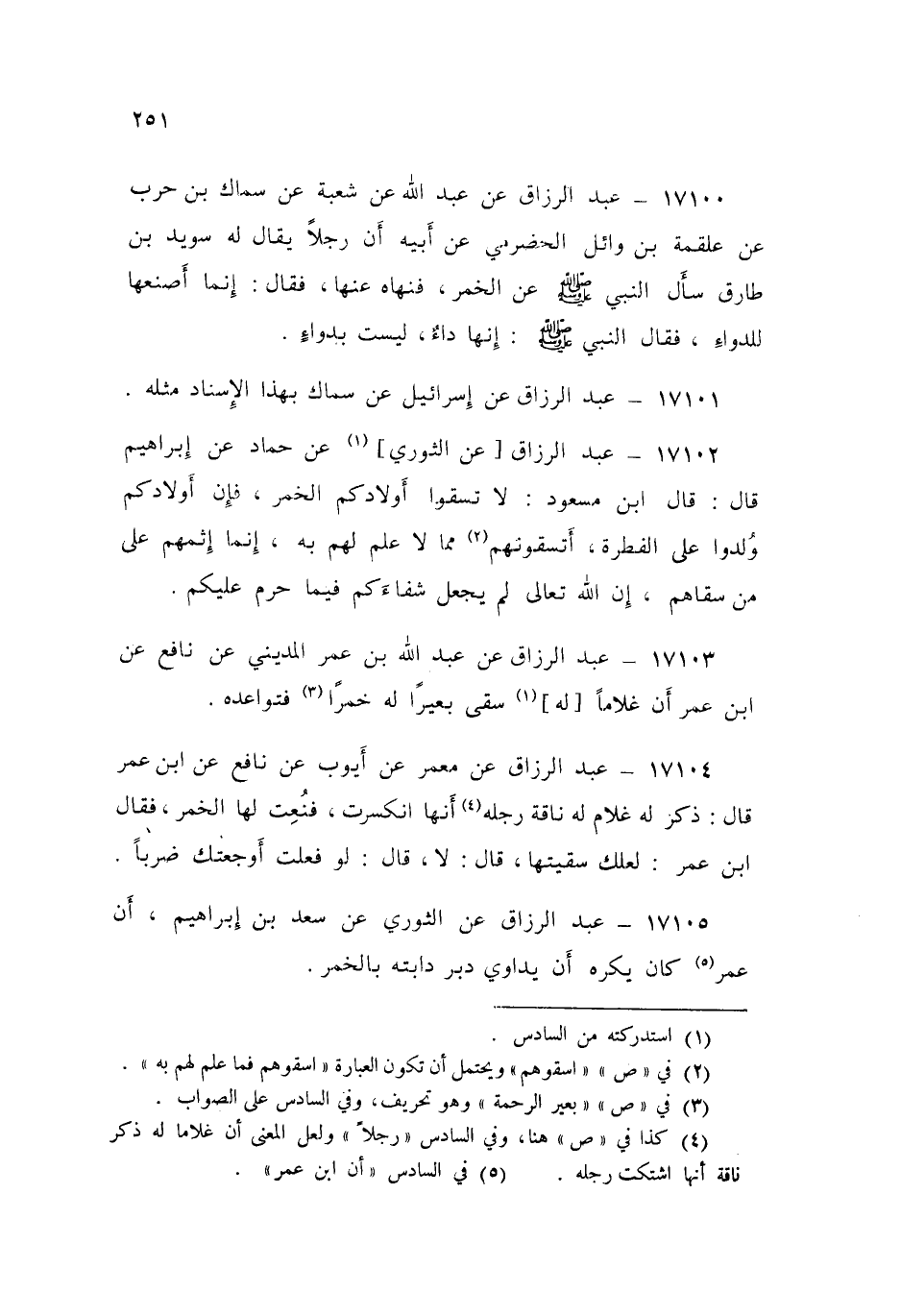 ١٧١٠٤ - عَنْ مَعْمَرٍ، عَنْ أَيُّوبَ، عَنْ نَافِعٍ، عَنِ ابْنِ عُمَرَ قَالَ: ذُكِرَ لَهُ غُلَامٌ لَهُ نَاقَةٌ رِجْلُهُ: أَنَّهَا انْكَسَرَتْ فَنُعِتَ لَهَا الْخَمْرُ، فَقَالَ ابْنُ عُمَرَ: «لَعَلَّكَ سَقَيْتَهَا» قَالَ: لَا قَالَ: «لَوْ فَعَلْتَ أَوْجَعْتُكَ ضَرْبًا»