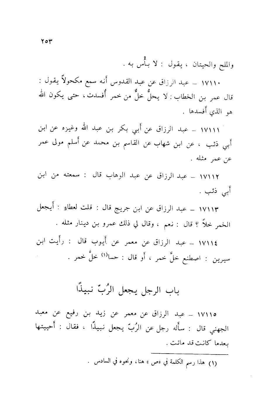 ١٧١١٥ - عَنْ مَعْمَرٍ، عَنْ زَيْدِ بْنِ رُفَيْعٍ، عَنْ مَعْبَدٍ الْجُهَنِيَّ قَالَ: «سَأَلَهُ رَجُلٌ عَنِ الرُّبِّ يُجْعَلُ نَبِيذًا» فَقَالَ: «أَحْيَيَتَهَا بَعْدَمَا كَانَتْ قَدْ مَاتَتْ»