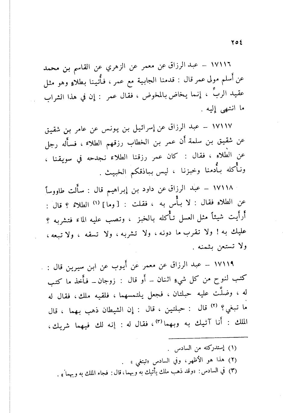 ١٧١٢٠ - عَنْ مَعْمَرٍ، عَنْ عَاصِمٍ، عَنِ الشَّعْبِيِّ قَالَ: «كَتَبَ عُمَرُ بْنُ الْخَطَّابِ إِلَى عَمَّارِ بْنِ يَاسِرٍ أَمَّا بَعْدُ، فَإِنَّهَا جَاءَتْنَا أَشْرِبَةٌ مِنْ قِبَلِ الشَّامِ كَأَنَّهَا طِلَاءُ الْإِبِلِ، قَدْ طُبِخَ حَتَّى ذَهَبَ ثُلُثَاهَا الَّذِي فِيهِ خَبَثُ الشَّيْطَانِ» - أَوْ قَالَ: «خَبِيثُ الشَّيْطَانِ - وَرِيحُ جُنُونِهِ، وَبَقِيَ ثُلُثُهُ، فَاصْطَبَغَهُ، وَمُرْ مَنْ قِبَلَكَ إِنْ يَصْطَبِغُوهُ»