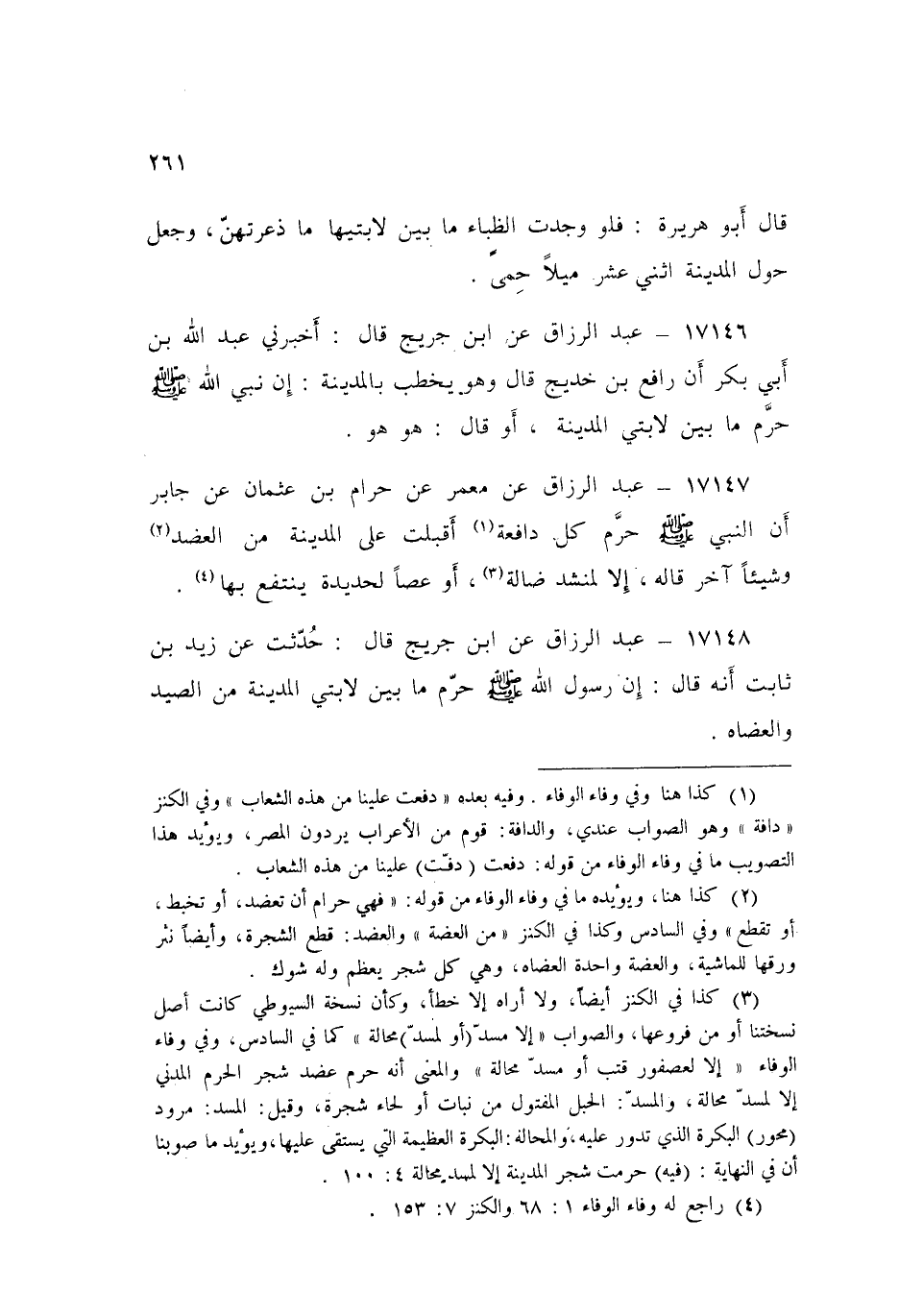 ١٧١٤٨ - عَنِ ابنِ جُرَيْجٍ قَالَ: حُدِّثْتُ عَنْ زَيْدِ بْنِ ثَابِتٍ، أَنَّهُ قَالَ: «إِنَّ رَسُولَ اللَّهِ صَلَّى اللهُ عَلَيْهِ وَسَلَّمَ حَرَّمَ مَا بَيْنَ لَابَتَيِ الْمَدِينَةِ مِنَ الصَّيْدِ وَالْعِضَاهِ»