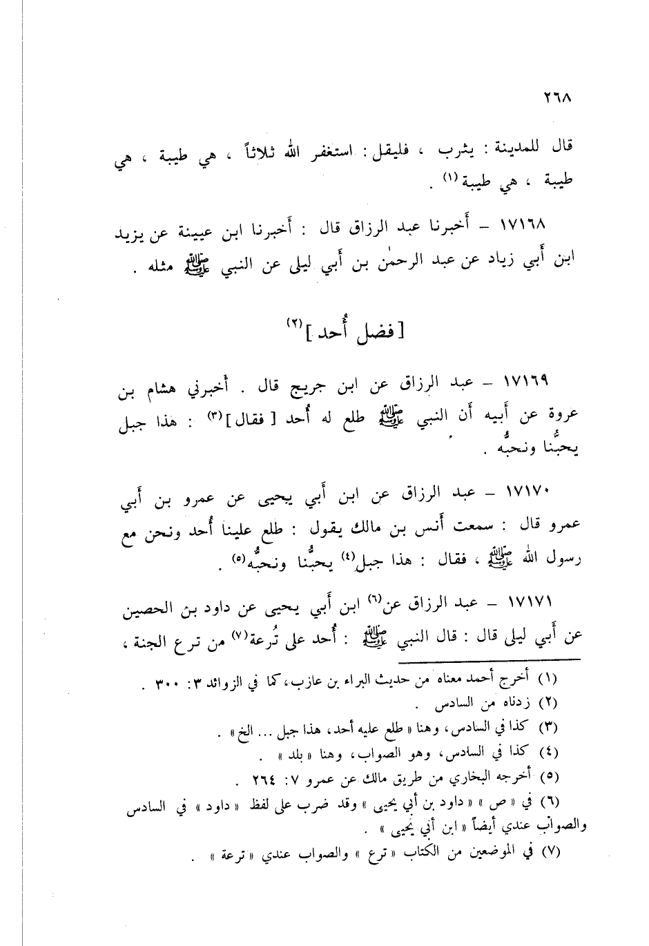 ١٧١٦٩ - عَنِ ابْنِ جُرَيْجٍ قَالَ: أَخْبَرَنِي هِشَامُ بْنُ عُرْوَةَ، عَنْ أَبِيهِ، أَنَّ النَّبِيَّ صَلَّى اللهُ عَلَيْهِ وَسَلَّمَ طَلَعَ لَهُ أُحُدٌ، فَقَالَ: «هَذَا جَبَلٌ يُحِبُّنَا وَنُحِبُّهُ»