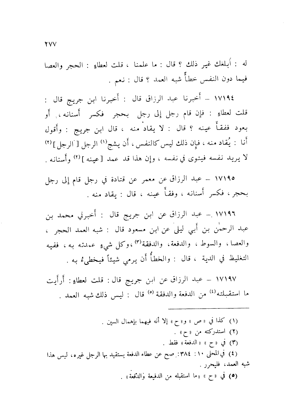 ١٧١٩٦ - عَنِ ابْنِ جُرَيْجٍ قَالَ: أَخْبَرَنِي مُحَمَّدُ بنُ عَبْدِ الرَّحْمَنِ بْنِ أَبِي لَيْلَى، عَنِ ابْنِ مَسْعُودٍ قَالَ: «شِبْهُ الْعَمْدِ الْحَجَرُ، وِالْعَصَا، وَالسَّوْطُ، وَالدَّفْعَةُ، وَالدَّفْقَةُ، وَكُلُّ شَيْءٍ عَمِدْتَهُ بِهِ فَفِيهِ التَّغْلِيظُ فِي الدِّيَةِ» قَالَ: «وَالْخَطَأُ أَنْ يَرْمِيَ شَيْئًا فَيُخْطِئَ بِهِ»
