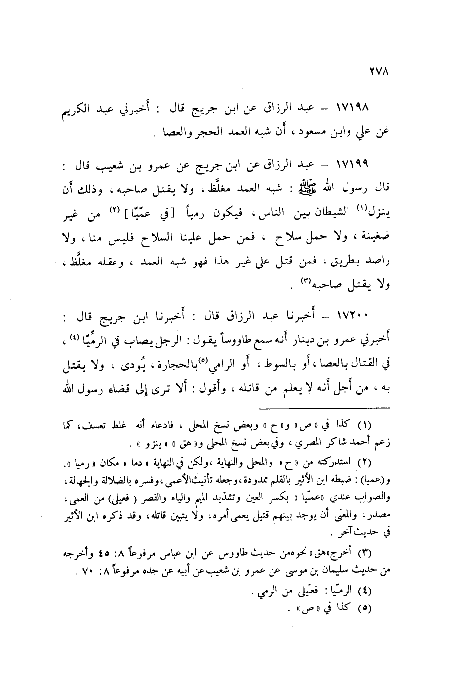 ١٧١٩٩ - عَنِ ابْنِ جُرَيْجٍ، عَنْ عَمْرِو بْنِ شُعَيْبٍ قَالَ: قَالَ رَسُولُ اللَّهِ صَلَّى اللهُ عَلَيْهِ وَسَلَّمَ: «شِبْهُ الْعَمْدِ مُغَلَّظٌ، وَلَا يُقْتَلُ صَاحِبُهُ وَذَلِكَ أَنْ يَنْزِلَ الشَّيْطَانُ بَيْنَ النَّاسِ فَيَكُونُ رَمْيًا فِي عَمِيَّا مِنْ غَيْرِ ضَغِينَةٍ، وَلَا حَمْلِ سِلَاحٍ فَمَنْ حَمَلَ عَلَيْنَا السِّلَاحَ، فَلَيْسَ مِنَّا وَلَا رَاصِدٍ بِطَرِيقٍ، فَمَنْ قُتِلَ عَلَى غَيْرِ هَذَا فَهُوَ شِبْهُ الْعَمْدِ، وَعَقْلُهُ مُغَلَّظٌ وَلَا يُقْتَلُ صَاحِبُهُ»