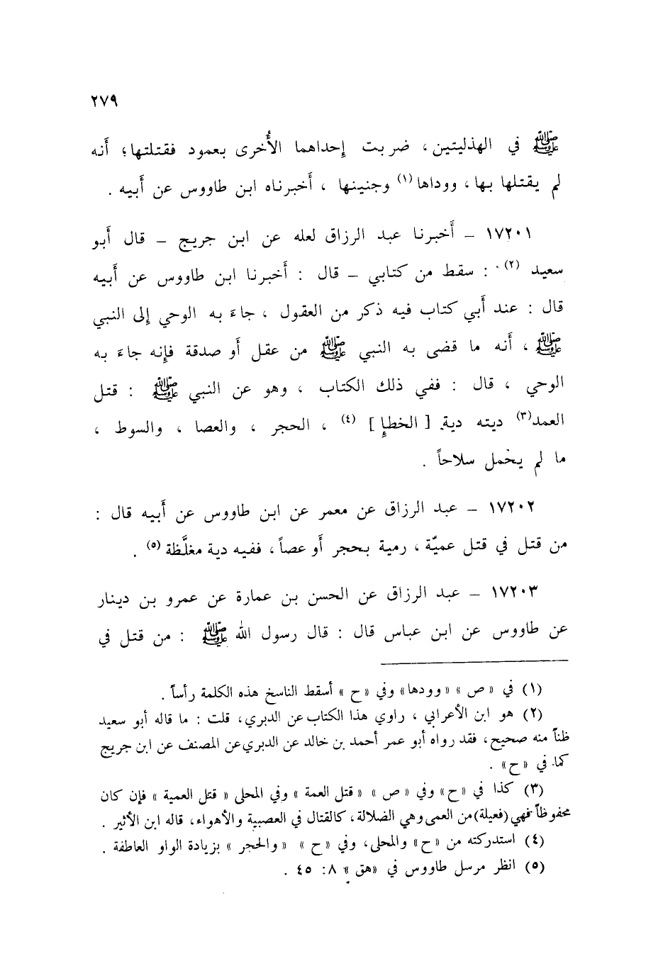 ١٧٢٠١ - أَخْبَرَنَا عَبْدُ الرَّزَّاقِ لَعَلَّهُ عَنِ ابْنِ جُرَيْجٍ قَالَ: أَبُو سَعِيدٍ سَقَطَ مِنْ كِتَابِي قَالَ: أَخْبَرَنَا ابْنُ طَاوُسٍ، عَنْ أَبِيهِ قَالَ: عِنْدَ أَبِي كِتَابٌ فِيهِ ذِكْرٌ مِنَ الْعُقُولِ جَاءَ بِهِ الْوَحْيُ إِلَى النَّبِيِّ صَلَّى اللهُ عَلَيْهِ وَسَلَّمَ أَنَّهُ مَا «قَضَى بِهِ النَّبِيُّ صَلَّى اللهُ عَلَيْهِ وَسَلَّمَ مِنْ عَقْلٍ أَوْ صَدَقَةٍ فَإِنَّهُ جَاءَ بِهِ الْوَحْيُ» قَالَ: فَفِي ذَلِكَ الْكِتَابِ وَهُوَ عَنِ النَّبِيِّ صَلَّى اللهُ عَلَيْهِ وَسَلَّمَ «قَتْلُ الْعَمْدِ دِيَتُهُ دِيَةُ الْخَطَأِ الْحَجَرُ، وَالْعَصَا، وَالسَّوْطُ مَا لَمْ يَحْمِلْ سِلَاحًا»