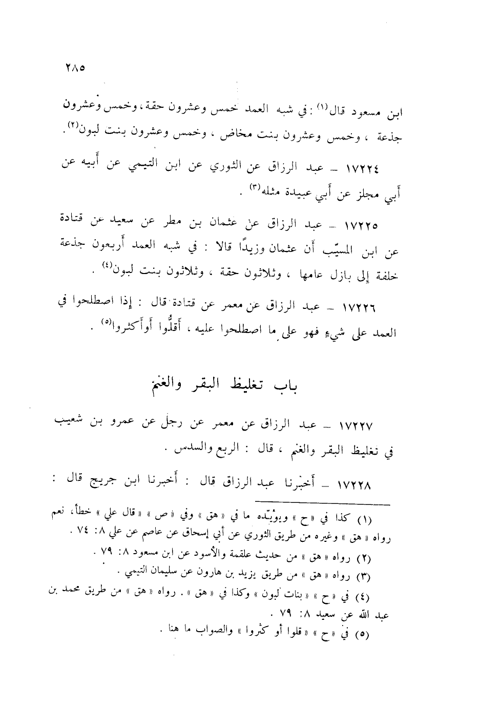١٧٢٢٨ - عَبْدُ الرَّزَّاقِ قَالَ: أَخْبَرَنَا ابْنُ جُرَيْجٍ قَالَ: قُلْتُ لِعَطَاءٍ: تَغْلِيظُ الْبَقَرِ وَالْغَنَمِ قَالَ: «مَا أَعْلَمُهُ»