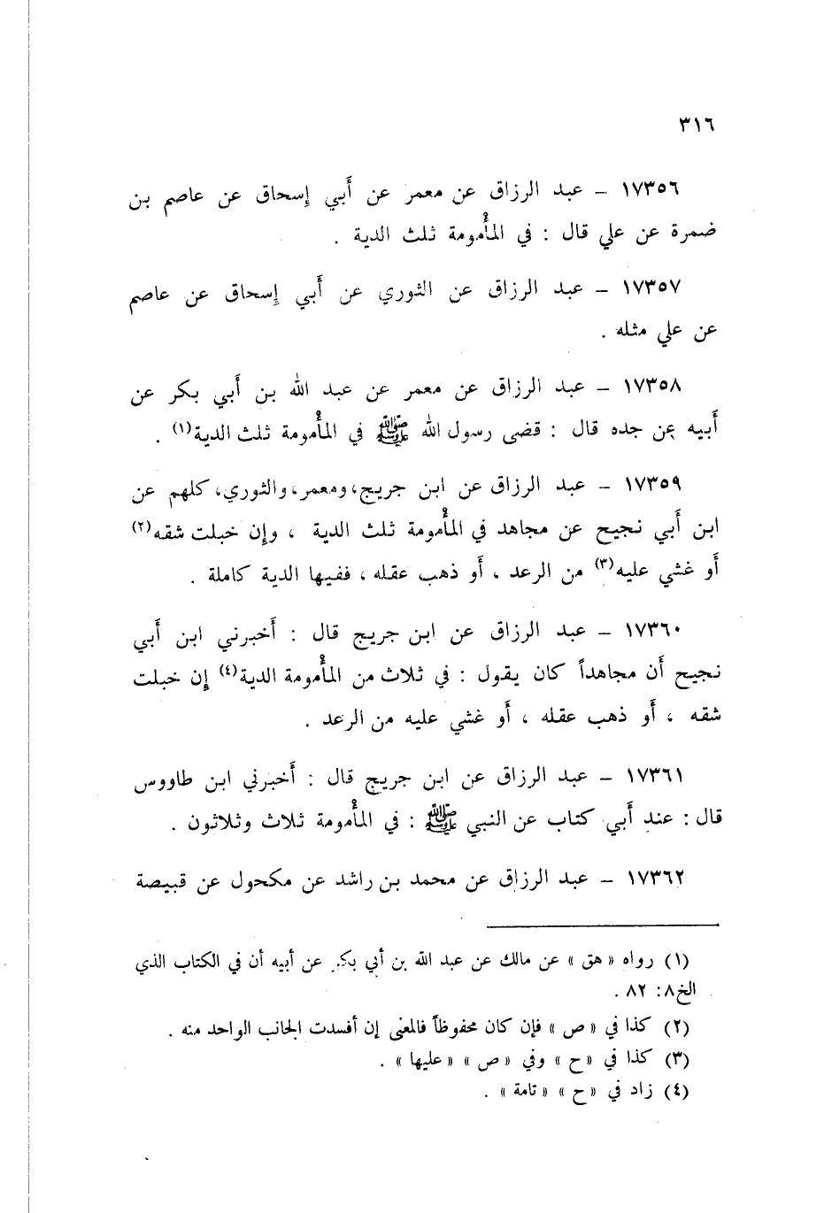 ١٧٣٦١ - عَنِ ابْنِ جُرَيْجٍ قَالَ: أَخْبَرَنِي ابْنُ طَاوُسٍ قَالَ: عِنْدَ أَبِي كِتَابٌ «عَنِ النَّبِيِّ صَلَّى اللهُ عَلَيْهِ وَسَلَّمَ فِي الْمَأْمُومَةِ ثَلَاثٌ وَثَلَاثُونَ»