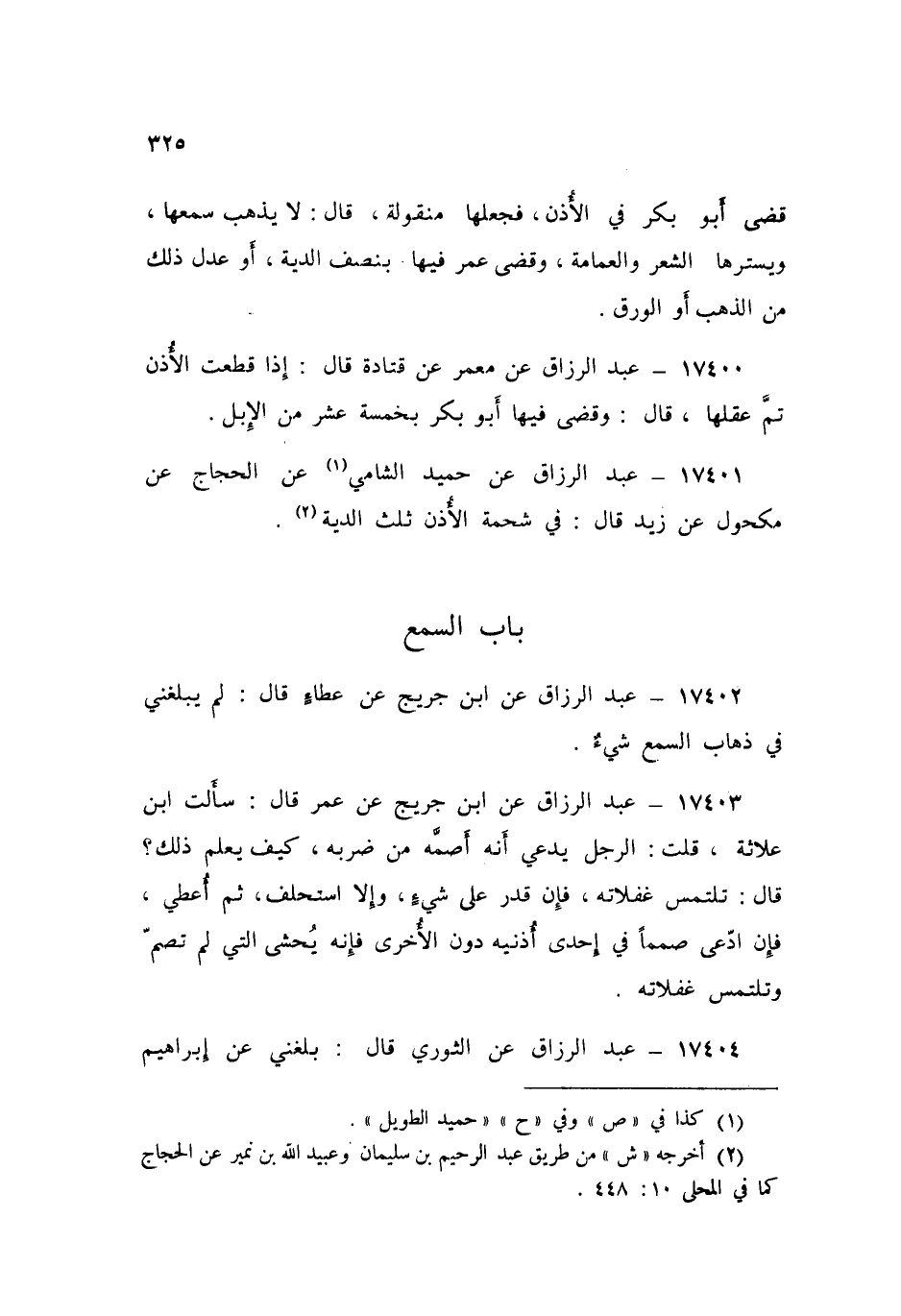 ١٧٤٠١ - عَنْ حُمَيْدٍ الشَّامِيِّ، عَنِ الْحَجَّاجِ، عَنْ مَكْحُولٍ، عَنْ زَيْدٍ قَالَ: «فِي شَحْمَةِ الْأُذُنِ ثُلُثُ الدِّيَةِ»