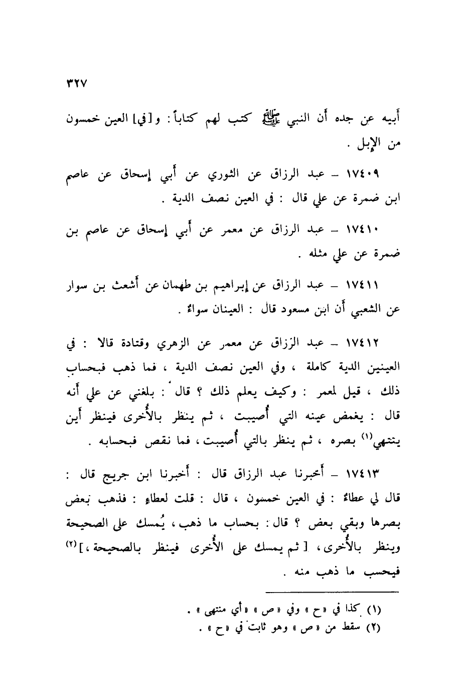 ١٧٤١٣ - عَبْدُ الرَّزَّاقِ قَالَ: أَخْبَرَنَا ابْنُ جُرَيْجٍ قَالَ: قَالَ لِي عَطَاءٌ: «فِي الْعَيْنِ خَمْسُونَ» قَالَ: قُلْتُ لِعَطَاءٍ: فَذَهَبَ بَعْضُ بَصَرِهَا وَبَقِي بَعْضٌ قَالَ: «بِحِسَابِ مَا ذَهَبَ يُمْسِكُ عَلَى الصَّحِيحَةِ وَيَنْظُرُ بِالْأُخْرَى، ثُمَّ يُمْسِكُ عَلَى الْأُخْرَى فَيَنْظُرُ بِالصَّحِيحَةِ فَيَحْسِبُ مَا ذَهَبَ مِنْهُ»