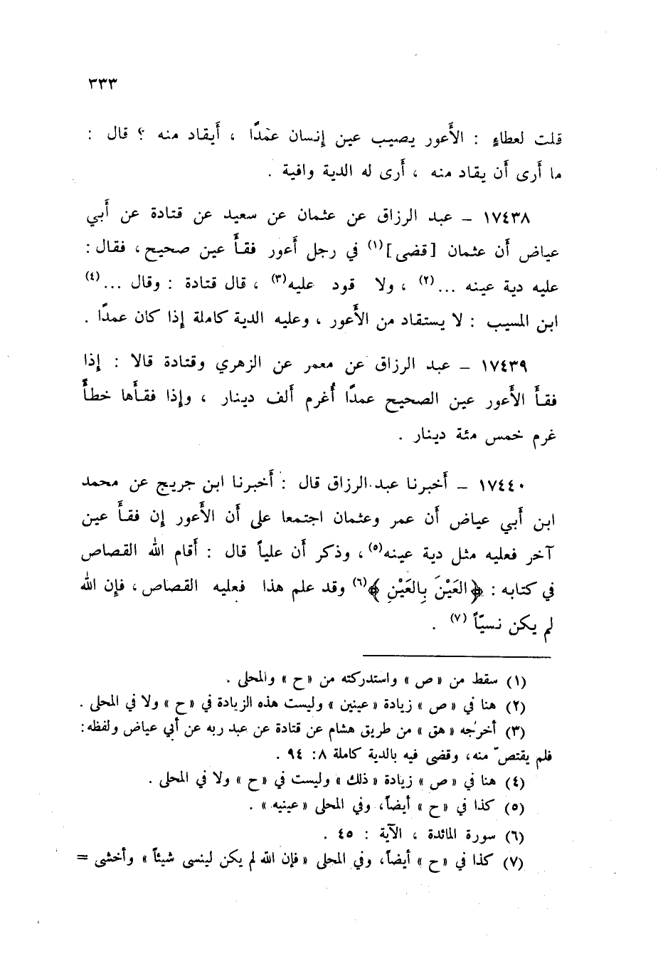 ١٧٤٤٠ - عَبْدُ الرَّزَّاقِ قَالَ: أَخْبَرَنَا ابْنُ جُرَيْجٍ، عَنْ مُحَمَّدِ بْنِ أَبِي عِيَاضٍ، أَنَّ عُمَرَ، وَعُثْمَانَ، «اجْتَمَعَا عَلَى أَنَّ الْأَعْوَرَ إِنْ فَقَأَ عَيْنَ آخَرَ فَعَلَيْهِ مِثْلُ دِيَةِ عَيْنِهِ» وَذَكَرَ أَنَّ عَلِيًّا قَالَ: أَقَامَ اللَّهُ الْقِصَاصَ فِي كِتَابِهِ {الْعَيْنَ بِالْعَيْنِ} [المائدة: ٤٥]، وَقَدْ عَلِمَ هَذَا فَعَلَيْهِ الْقِصَاصُ فَإِنَّ اللَّهَ لَمْ يَكُنْ نَسِيًّا
