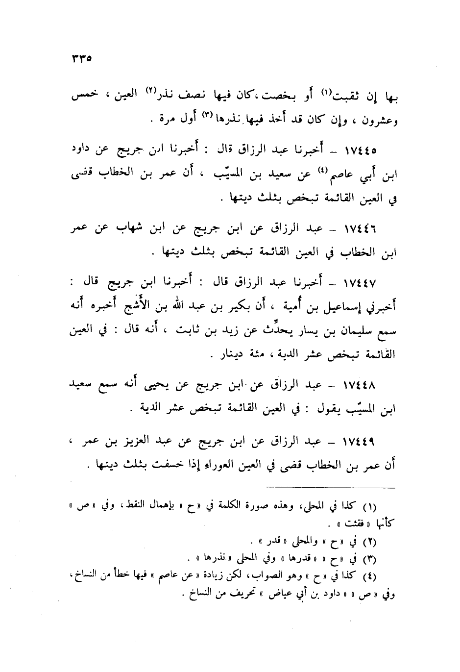 ١٧٤٤٦ - عَنِ ابْنِ جُرَيْجٍ، عَنِ ابْنِ شِهَابٍ، عَنْ عُمَرَ بْنِ الْخَطَّابِ، «فِي الْعَيْنِ الْقَائِمَةِ تُبْخَصُ بِثُلُثِ دِيَتِهَا»