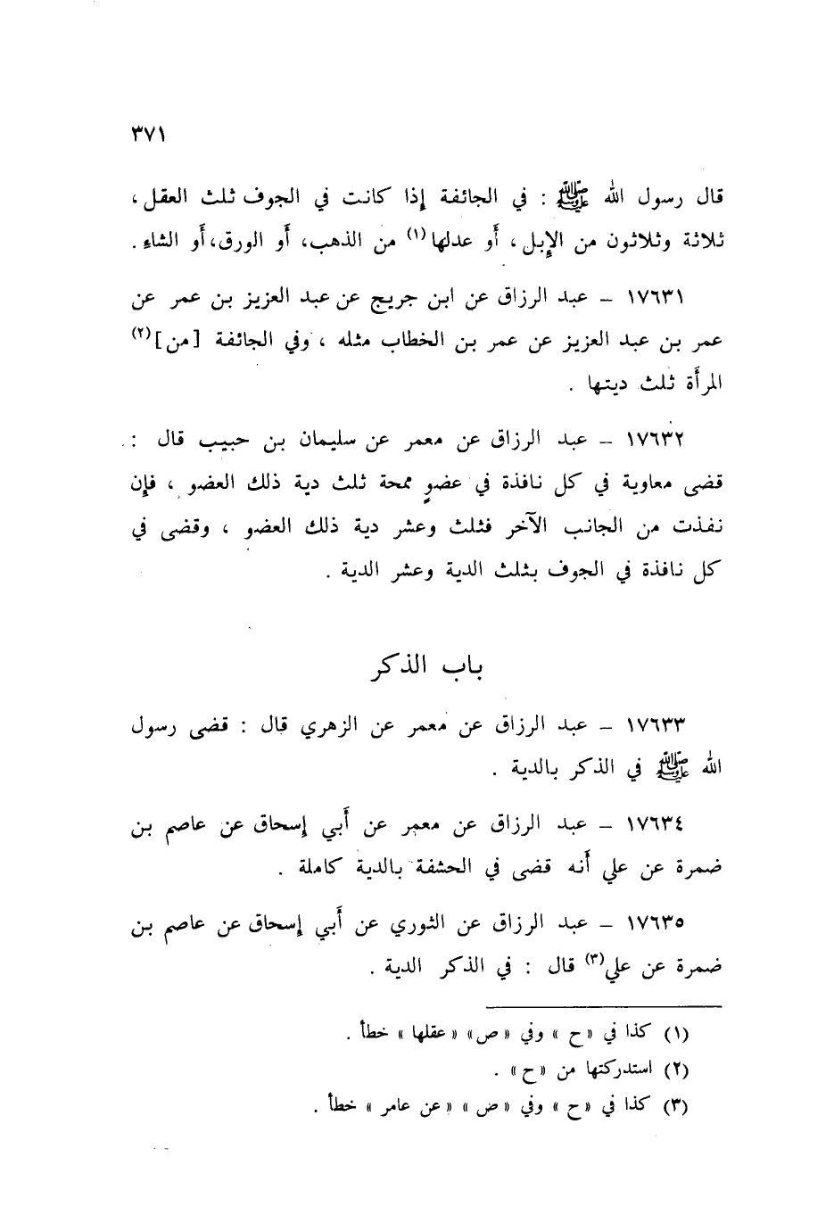 ١٧٦٣٣ - عَنْ مَعْمَرٍ، عَنِ الزُّهْرِيِّ قَالَ: قَضَى رَسُولُ اللَّهِ صَلَّى اللهُ عَلَيْهِ وَسَلَّمَ فِي الذَّكَرِ بِالدِّيَةِ "