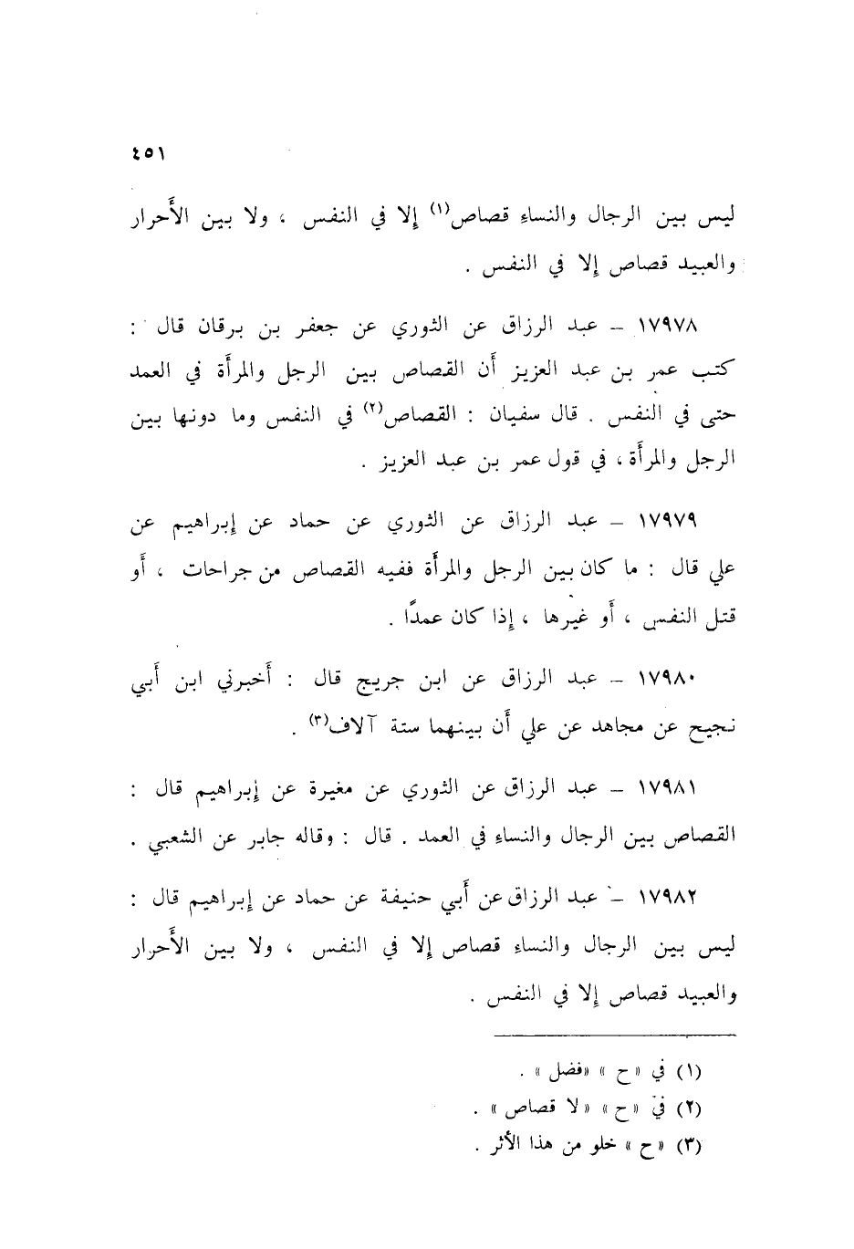 ١٧٩٧٩ - عَنِ الثَّوْرِيِّ، عَنْ حَمَّادٍ، عَنْ إِبْرَاهِيمَ، عَنْ عَلِيٍّ قَالَ: «مَا كَانَ بَيْنَ الرَّجُلِ وَالْمَرْأَةِ، فَفِيهِ الْقِصَاصُ مِنْ جِرَاحَاتٍ، أَوْ قَتْلِ النَّفْسِ، أَوْ غَيْرِهَا إِذَا كَانَ عَمْدًا»