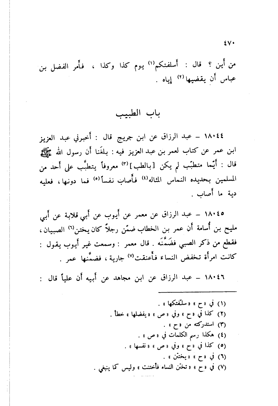 ١٨٠٤٥ - عَنْ مَعْمَرٍ، عَنْ أَيُّوبَ، عَنْ أَبِي قِلَابَةَ، عَنْ أَبِي مَلِيحِ بْنِ أُسَامَةَ، أَنَّ عُمَرَ بْنَ الْخَطَّابِ، «ضَمَّنَ رَجُلًا كَانَ يَخْتِنُ الصِّبْيَانَ، فَقَطَعَ مِنْ ذَكَرِ الصَّبِيِّ فَضَمَّنَهُ»، قَالَ مَعْمَرٌ: وَسَمِعْتُ غَيْرَ أَيُّوبَ يَقُولُ: «كَانَتِ امْرَأَةٌ تَخْفِضُ النِّسَاءَ فَأَعْنَقَتْ جَارِيَةً فَضَمَّنَهَا عُمَرُ»