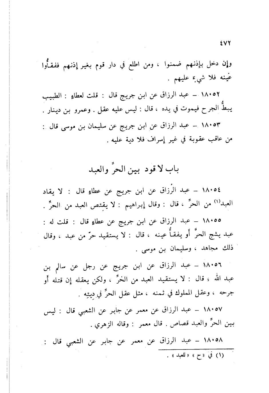 ١٨٠٥٥ - عَنِ ابْنِ جُرَيْجٍ، عَنْ عَطَاءٍ قَالَ: قُلْتُ لَهُ: عَبْدٌ يَشُجُّ الْحُرَّ أَوْ يَفْقَأُ عَيْنَهُ قَالَ: «لَا يَسْتَقِيدُ حُرٌّ مِنْ عَبْدٍ» وَقَالَ ذَلِكَ مُجَاهِدٌ: وَسُلَيْمَانُ بْنُ مُوسَى