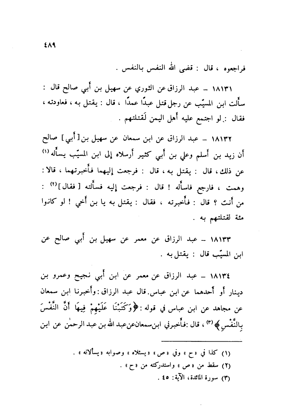١٨١٣٤ - عَنْ مَعْمَرٍ، عَنِ ابْنِ أَبِي نَجِيحٍ، وَعَمْرِو بْنِ دِينَارٍ، أَوْ أَحَدِهِمَا عَنِ ابْنِ عَبَّاسٍ قَالَ عَبْدُ الرَّزَّاقِ: وَأَخْبَرَنَا ابْنُ سَمْعَانَ، عَنْ مُجَاهِدٍ، عَنِ ابْنِ عَبَّاسٍ فِي قَوْلِهِ: «وَكَتَبْنَا عَلَيْهِمْ فِيهِا أَنَّ النَّفْسَ بِالنَّفْسِ» قَالَ: فَأَخْبَرَنِي ابْنُ سَمْعَانَ، عَنْ عَبْدِ اللَّهِ بْنِ عَبْدِ الرَّحْمَنِ، عَنِ ابْنِ الْمُسَيِّبِ قَالَ: كَتَبَ ذَلِكَ عَلَى بَنِي إِسْرَائِيلَ، فَهَذِهِ الْآيَةُ لَنَا، وَلَهُمْ