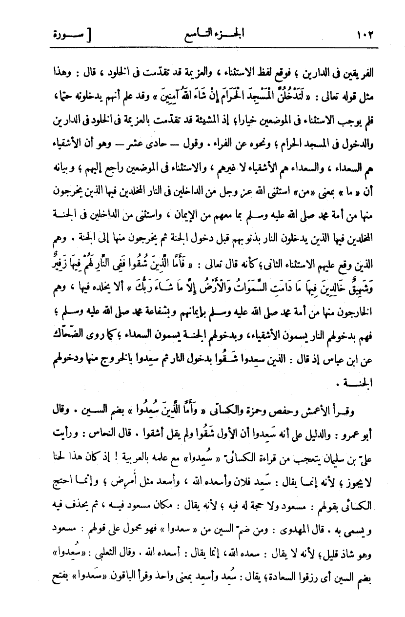 الْفَرِيقَيْنِ فِي الدَّارَيْنِ، فَوَقَعَ لَفْظُ الِاسْتِثْنَاءِ، وَالْعَزِيمَةُ قَدْ تَقَدَّمَتْ فِي الْخُلُودِ، قَالَ: وَهَذَا مِثْلُ قَوْلُهُ تَعَالَى:" لَتَدْخُلُنَّ الْمَسْجِدَ الْحَرامَ إِنْ شاءَ اللَّهُ آمِنِينَ" [الفتح: ٢٧ [وَقَدْ عَلِمَ أَنَّهُمْ يَدْخُلُونَهُ حَتْمًا، فَلَمْ يُوجِبِ الِاسْتِثْنَاءُ فِي الْمَوْضِعَيْنِ خِيَارًا، إِذِ الْمَشِيئَةُ قَدْ تقدمة، بِالْعَزِيمَةِ فِي الْخُلُودِ فِي الدَّارَيْنِ وَالدُّخُولِ فِي الْمَسْجِدِ الْحَرَامِ، وَنَحْوُهُ عَنِ الْفَرَّاءِ. وَقَوْلٌ: حَادِيَ عَشَرَ- وَهُوَ أَنَّ الْأَشْقِيَاءَ هُمُ السُّعَدَاءُ، وَالسُّعَدَاءُ هُمُ الْأَشْقِيَاءُ لَا غَيْرُهُمْ، وَالِاسْتِثْنَاءُ فِي الْمَوْضِعَيْنِ رَاجِعٌ إِلَيْهِمْ، وَبَيَانُهُ أَنَّ" مَا" بِمَعْنَى" مَنْ" اسْتَثْنَى اللَّهُ عَزَّ وَجَلَّ مِنَ الدَّاخِلِينَ فِي النَّارِ الْمُخَلَّدِينَ فِيهَا الَّذِينَ يُخْرَجُونَ مِنْهَا مِنْ أُمَّةِ مُحَمَّدٍ صَلَّى اللَّهُ عَلَيْهِ وَسَلَّمَ بِمَا مَعَهُمْ مِنَ الْإِيمَانِ، وَاسْتَثْنَى مِنَ الدَّاخِلِينَ فِي الْجَنَّةِ الْمُخَلَّدِينَ فِيهَا الَّذِينَ يَدْخُلُونَ النَّارَ بِذُنُوبِهِمْ قَبْلَ دُخُولِ الْجَنَّةِ ثُمَّ يُخْرَجُونَ مِنْهَا إِلَى الْجَنَّةِ. وَهُمُ الَّذِينَ وَقَعَ عَلَيْهِمُ الِاسْتِثْنَاءُ الثَّانِي، كَأَنَّهُ قَالَ تَعَالَى:" فَأَمَّا الَّذِينَ شَقُوا فَفِي النَّارِ لَهُمْ فِيها زَفِيرٌ وَشَهِيقٌ خالِدِينَ فِيها مَا دامَتِ السَّماواتُ وَالْأَرْضُ إِلَّا مَا شاءَ رَبُّكَ" أَلَّا يُخَلِّدَهُ فِيهَا، وَهُمُ الْخَارِجُونَ مِنْهَا مِنْ أُمَّةِ مُحَمَّدٍ صَلَّى اللَّهُ عَلَيْهِ وَسَلَّمَ بِإِيمَانِهِمْ وَبِشَفَاعَةِ مُحَمَّدٍ صَلَّى اللَّهُ عَلَيْهِ وَسَلَّمَ، فَهُمْ بِدُخُولِهِمُ النَّارَ يُسَمَّوْنَ الْأَشْقِيَاءَ، وَبِدُخُولِهِمُ الْجَنَّةَ يُسَمَّوْنَ السُّعَدَاءَ، كَمَا رَوَى الضَّحَّاكُ عَنِ ابْنِ عَبَّاسٍ إِذْ قَالَ: الَّذِينَ سَعِدُوا شَقُوا بِدُخُولِ النَّارِ ثُمَّ سَعِدُوا بِالْخُرُوجِ مِنْهَا وَدُخُولِهِمُ الْجَنَّةَ. وَقَرَأَ الْأَعْمَشُ وَحَفْصٌ وَحَمْزَةُ وَالْكِسَائِيُّ" وَأَمَّا الَّذِينَ سُعِدُوا" بِضَمِّ السِّينِ. وَقَالَ أَبُو عَمْرٍو: وَالدَّلِيلُ عَلَى أَنَّهُ سَعِدُوا أَنَّ الْأَوَّلَ شَقُوا وَلَمْ يَقُلْ أُشْقُوا. قَالَ النَّحَّاسُ: وَرَأَيْتُ عَلِيَّ بْنَ سُلَيْمَانَ يَتَعَجَّبُ مِنْ قِرَاءَةِ الْكِسَائِيِّ" سُعِدُوا" مَعَ عِلْمِهِ بِالْعَرَبِيَّةِ! إِذْ كَانَ هَذَا لَحْنًا لَا يَجُوزُ، لِأَنَّهُ إِنَّمَا يُقَالُ: سَعِدَ فُلَانٌ وَأَسْعَدَهُ اللَّهُ، وَأَسْعَدَ مِثْلُ أَمْرَضَ، وَإِنَّمَا احْتَجَّ الْكِسَائِيُّ بِقَوْلِهِمْ: مَسْعُودٌ وَلَا حُجَّةَ لَهُ فِيهِ، لِأَنَّهُ يُقَالُ: مَكَانٌ مَسْعُودٌ فِيهِ، ثُمَّ يُحْذَفُ فِيهِ ويسمى به. قال الْمَهْدَوِيُّ: وَمَنْ ضَمَّ السِّينَ مِنْ" سُعِدُوا" فَهُوَ مَحْمُولٌ عَلَى قَوْلِهِمْ: مَسْعُودٌ وَهُوَ شَاذٌّ قَلِيلٌ، لِأَنَّهُ لَا يُقَالُ: سَعِدَهُ اللَّهُ، إِنَّمَا يُقَالُ: أَسْعَدَهُ اللَّهُ. وَقَالَ الثَّعْلَبِيُّ:" سُعِدُوا" بِضَمِّ السِّينِ أَيْ رُزِقُوا السَّعَادَةَ، يُقَالُ: سَعِدَ وَأَسْعَدَ بِمَعْنًى وَاحِدٍ وَقَرَأَ الْبَاقُونَ" سُعِدُوا" بِفَتْحِ