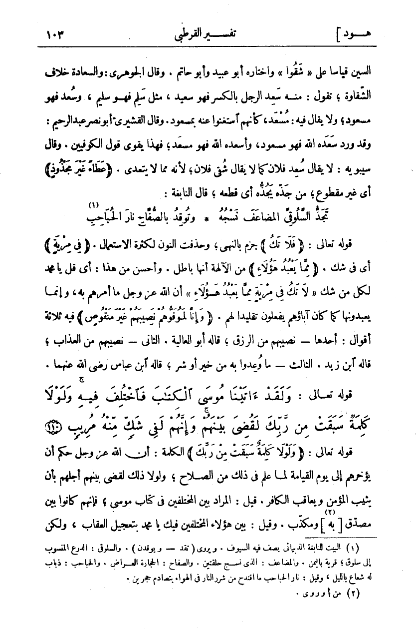 قَوْلُهُ تَعَالَى: (فَلا تَكُ) جَزْمٌ بِالنَّهْيِ، وَحُذِفَتِ النُّونُ لِكَثْرَةِ الِاسْتِعْمَالِ. (فِي مِرْيَةٍ) أَيْ فِي شَكٍّ. (مِمَّا يَعْبُدُ هؤُلاءِ) مِنَ الْآلِهَةِ أَنَّهَا بَاطِلٌ. وَأَحْسَنُ مِنْ هَذَا: أَيْ قُلْ يا محمد لكل من شك" فَلا تَكُ فِي مِرْيَةٍ مِمَّا يَعْبُدُ هؤُلاءِ" أَنَّ اللَّهَ عَزَّ وَجَلَّ مَا أَمَرَهُمْ بِهِ، وَإِنَّمَا يَعْبُدُونَهَا كَمَا كَانَ آبَاؤُهُمْ يَفْعَلُونَ تَقْلِيدًا لَهُمْ. (وَإِنَّا لَمُوَفُّوهُمْ نَصِيبَهُمْ غَيْرَ مَنْقُوصٍ) فِيهِ ثَلَاثَةُ أَقْوَالٍ: أَحَدُهَا- نَصِيبُهُمْ مِنَ الرِّزْقِ، قَالَهُ أبو العالية. الثاني- نصيبهم من العذاب، قال ابْنُ زَيْدٍ. الثَّالِثُ- مَا وُعِدُوا بِهِ مِنْ خَيْرٍ أَوْ شَرٍّ، قَالَهُ ابْنُ عَبَّاسٍ رَضِيَ الله عنهما.