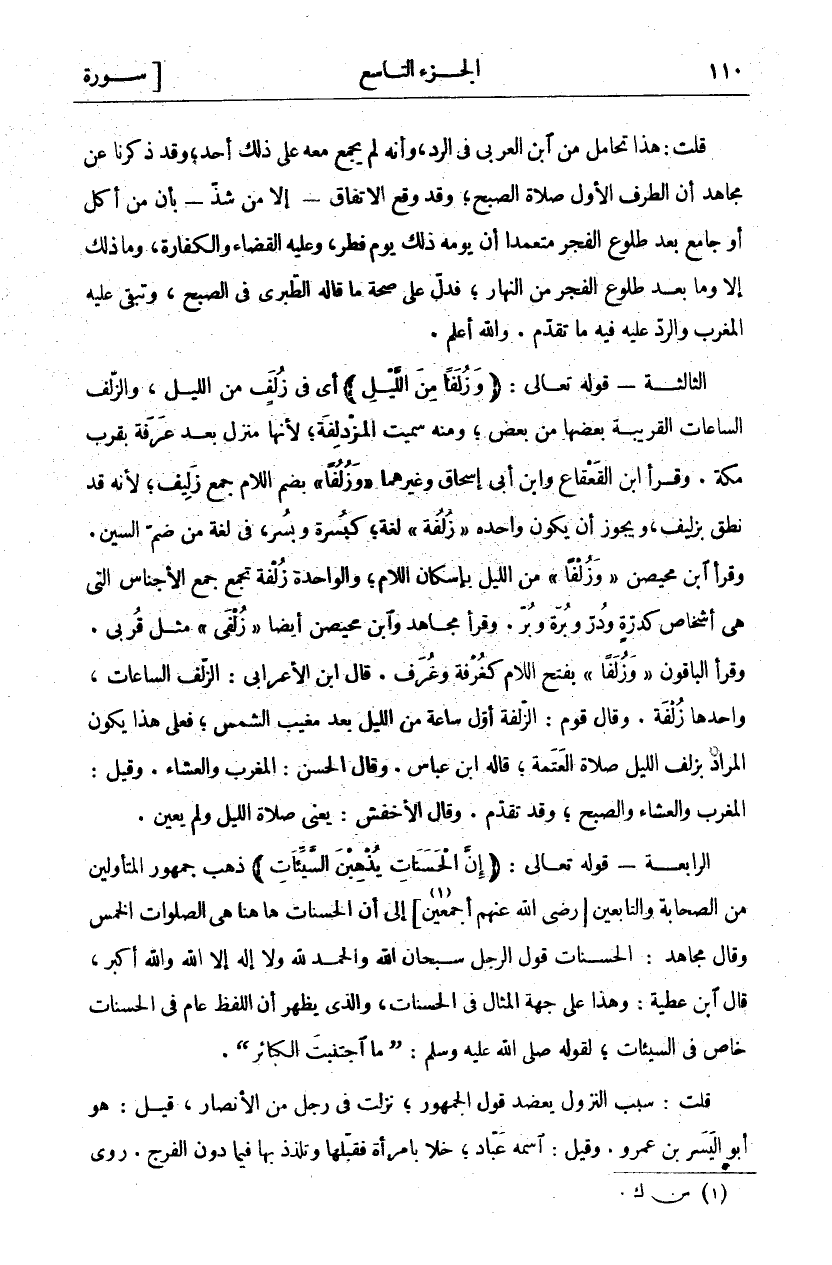 قُلْتُ: هَذَا تَحَامُلٌ مِنَ ابْنِ الْعَرَبِيِّ فِي الرَّدِّ، وَأَنَّهُ لَمْ يُجْمِعْ مَعَهُ عَلَى ذَلِكَ أَحَدٌ، وَقَدْ ذَكَرْنَا عَنْ مُجَاهِدٍ أَنَّ الطَّرَفَ الْأَوَّلَ صَلَاةُ الصُّبْحِ، وَقَدْ وَقَعَ الِاتِّفَاقُ- إِلَّا مَنْ شَذَّ بِأَنَّ مَنْ أَكَلَ أَوْ جَامَعَ بَعْدَ طُلُوعِ الْفَجْرِ مُتَعَمِّدًا أَنَّ يَوْمَهُ ذَلِكَ يَوْمُ فِطْرٍ، وَعَلَيْهِ الْقَضَاءُ وَالْكَفَّارَةُ، وَمَا ذَلِكَ إِلَّا وَمَا بَعْدَ طُلُوعِ الْفَجْرِ مِنَ النَّهَارِ، فَدَلَّ عَلَى صِحَّةِ مَا قَالَهُ الطَّبَرِيُّ فِي الصُّبْحِ، وَتَبْقَى عَلَيْهِ الْمَغْرِبُ وَالرَّدُّ عَلَيْهِ فِيهِ مَا تَقَدَّمَ. وَاللَّهُ أَعْلَمُ. الثَّالِثَةُ- قَوْلُهُ تَعَالَى: (وَزُلَفاً مِنَ اللَّيْلِ) أَيْ فِي زُلَفٍ مِنَ اللَّيْلِ، وَالزُّلَفُ السَّاعَاتُ الْقَرِيبَةُ بَعْضُهَا مِنْ بَعْضٍ، وَمِنْهُ سُمِّيَتِ الْمُزْدَلِفَةُ، لِأَنَّهَا مَنْزِلٌ بَعْدَ عَرَفَةَ بِقُرْبِ مَكَّةَ. وَقَرَأَ ابْنُ الْقَعْقَاعِ وَابْنُ أَبِي إِسْحَاقَ وَغَيْرُهُمَا" وَزُلُفًا" بِضَمِّ اللَّامِ جَمْعُ زَلِيفٍ، لِأَنَّهُ قَدْ نَطَقَ بِزَلِيفٍ، وَيَجُوزُ أَنْ يَكُونَ وَاحِدُهُ" زُلْفَةً" لُغَةً، كَبُسْرَةٍ وَبُسُرٍ، فِي لُغَةِ مَنْ ضَمَّ السِّينَ. وَقَرَأَ ابْنُ مُحَيْصِنٍ" وَزُلْفًا" مِنَ اللَّيْلِ بِإِسْكَانِ اللَّامِ، وَالْوَاحِدَةُ زُلْفَةٌ تُجْمَعُ جَمْعَ الْأَجْنَاسِ الَّتِي هِيَ أَشْخَاصٌ كَدُرَّةٍ وَدُرٍّ وَبُرَّةٍ وَبُرٍّ. وَقَرَأَ مُجَاهِدٌ وَابْنُ مُحَيْصِنٍ أَيْضًا" زُلْفَى" مِثْلَ قُرْبَى. وَقَرَأَ الْبَاقُونَ" وَزُلَفاً" بِفَتْحِ اللَّامِ كَغُرْفَةٍ وَغُرَفٍ. قَالَ ابْنُ الْأَعْرَابِيِّ: الزُّلَفُ السَّاعَاتُ، وَاحِدُهَا زُلْفَةٌ. وَقَالَ قَوْمٌ: الزُّلْفَةُ أَوَّلُ سَاعَةٍ مِنَ اللَّيْلِ بَعْدَ مَغِيبِ الشَّمْسِ، فَعَلَى هَذَا يَكُونُ الْمُرَادُ بِزُلَفِ اللَّيْلِ صَلَاةَ الْعَتَمَةِ، قَالَهُ ابْنُ عَبَّاسٍ. وَقَالَ الْحَسَنُ: الْمَغْرِبُ وَالْعِشَاءُ. وَقِيلَ: الْمَغْرِبُ وَالْعِشَاءُ وَالصُّبْحُ، وَقَدْ تَقَدَّمَ. وَقَالَ الْأَخْفَشُ: يَعْنِي صَلَاةَ اللَّيْلِ وَلَمْ يُعَيِّنْ. الرَّابِعَةُ- قَوْلُهُ تَعَالَى: (إِنَّ الْحَسَناتِ يُذْهِبْنَ السَّيِّئاتِ) ذَهَبَ جُمْهُورُ الْمُتَأَوِّلِينَ مِنَ الصَّحَابَةِ وَالتَّابِعِينَ [رَضِيَ اللَّهُ عَنْهُمْ أَجْمَعِينَ «١»] إِلَى أَنَّ الْحَسَنَاتِ هَاهُنَا هِيَ الصَّلَوَاتُ الْخَمْسُ وَقَالَ مُجَاهِدٌ: الْحَسَنَاتُ قَوْلُ الرَّجُلِ سُبْحَانَ اللَّهِ وَالْحَمْدُ لِلَّهِ وَلَا إِلَهَ إِلَّا اللَّهُ وَاللَّهُ أَكْبَرُ، قَالَ ابْنُ عَطِيَّةَ: وَهَذَا عَلَى جِهَةِ الْمِثَالِ فِي الْحَسَنَاتِ، وَالَّذِي يَظْهَرُ أَنَّ اللَّفْظَ عَامٌّ فِي الْحَسَنَاتِ خَاصٌّ فِي السَّيِّئَاتِ، لِقَوْلِهِ صَلَّى اللَّهُ عَلَيْهِ وَسَلَّمَ:" مَا اجْتُنِبَتِ الْكَبَائِرُ". قُلْتُ: سَبَبُ النُّزُولِ يُعَضِّدُ قَوْلَ الْجُمْهُورِ، نَزَلَتْ فِي رَجُلٍ مِنَ الْأَنْصَارِ، قِيلَ: هُوَ أَبُو الْيُسْرِ بْنُ عَمْرٍو. وَقِيلَ: اسْمُهُ عَبَّادٌ، خَلَا بِامْرَأَةٍ فَقَبَّلَهَا وَتَلَذَّذَ بِهَا فِيمَا دون الفرج. روى