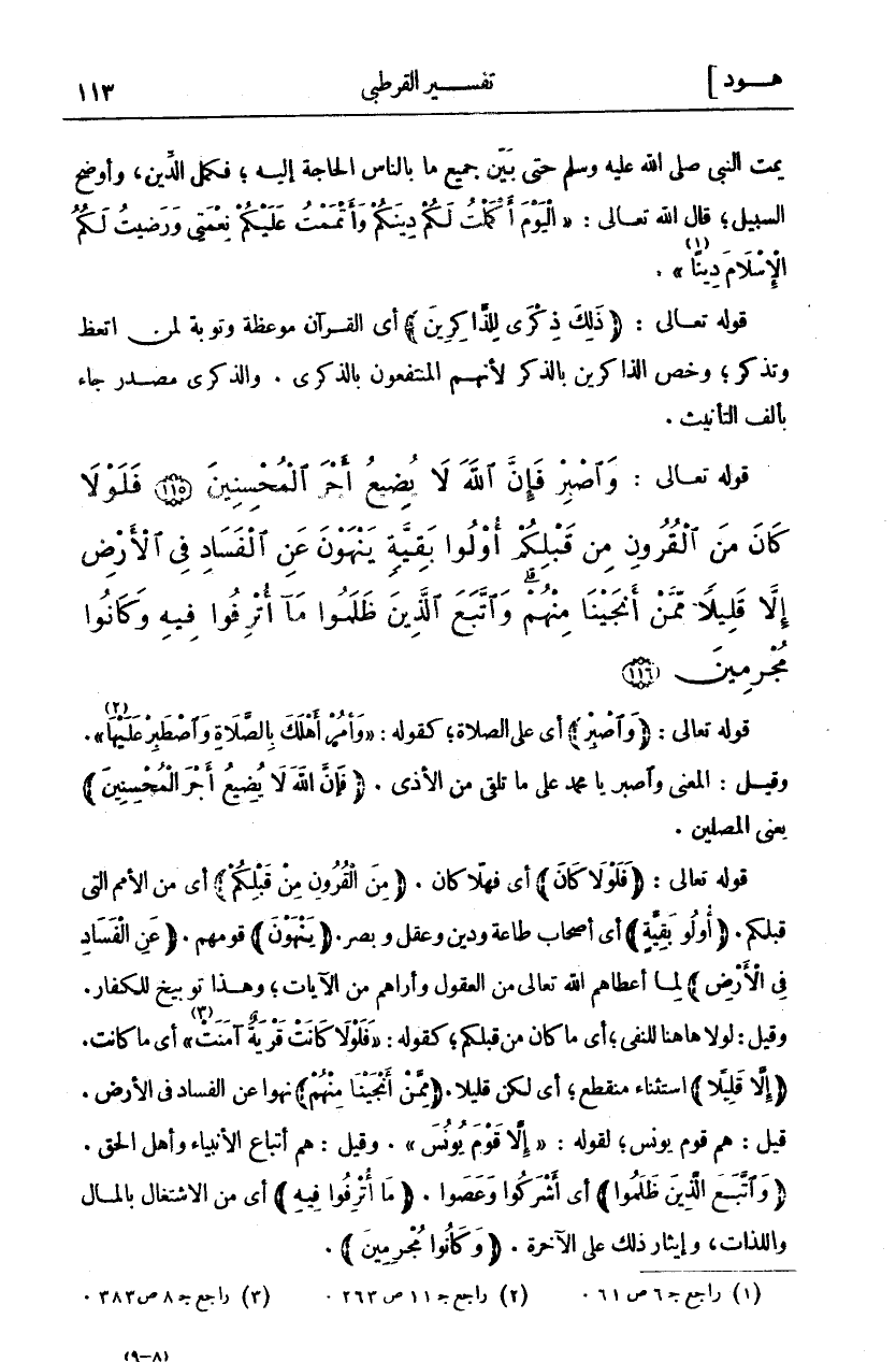 وَاصْبِرْ فَإِنَّ اللَّهَ لَا يُضِيعُ أَجْرَ الْمُحْسِنِينَ (١١٥) فَلَوْلا كانَ مِنَ الْقُرُونِ مِنْ قَبْلِكُمْ أُولُوا بَقِيَّةٍ يَنْهَوْنَ عَنِ الْفَسادِ فِي الْأَرْضِ إِلاَّ قَلِيلاً مِمَّنْ أَنْجَيْنا مِنْهُمْ وَاتَّبَعَ الَّذِينَ ظَلَمُوا مَا أُتْرِفُوا فِيهِ وَكانُوا مُجْرِمِينَ (١١٦)