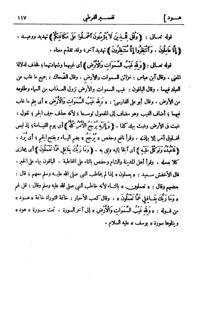 قَوْلُهُ تَعَالَى: (وَقُلْ لِلَّذِينَ لَا يُؤْمِنُونَ اعْمَلُوا عَلى مَكانَتِكُمْ) تَهْدِيدٌ وَوَعِيدٌ. (إِنَّا عامِلُونَ. وَانْتَظِرُوا إِنَّا مُنْتَظِرُونَ) تَهْدِيدٌ آخَرُ، وَقَدْ تَقَدَّمَ مَعْنَاهُ. قَوْلُهُ تَعَالَى: (وَلِلَّهِ غَيْبُ السَّماواتِ وَالْأَرْضِ) أَيْ غَيْبُهُمَا وَشَهَادَتُهُمَا، فَحُذِفَ لِدَلَالَةِ الْمَعْنَى. وَقَالَ ابْنُ عباس: خزائن السموات وَالْأَرْضِ وَقَالَ الضَّحَّاكُ: جَمِيعُ مَا غَابَ عَنِ العباد فيهما. وقال الباقون: غيب السموات وَالْأَرْضِ نُزُولُ الْعَذَابِ مِنَ السَّمَاءِ وَطُلُوعُهُ مِنَ الْأَرْضِ. وَقَالَ أَبُو عَلِيٍّ الْفَارِسِيُّ:" وَلِلَّهِ غَيْبُ السَّماواتِ وَالْأَرْضِ" أَيْ عَلِمَ مَا غَابَ فِيهِمَا، أَضَافَ الْغَيْبُ وَهُوَ مُضَافٌ إِلَى الْمَفْعُولِ تَوَسُّعًا، لِأَنَّهُ حَذَفَ حَرْفَ الْجَرِّ، تَقُولُ: غِبْتُ فِي الْأَرْضِ وَغِبْتُ بِبَلَدِ كَذَا. (وَإِلَيْهِ يُرْجَعُ الْأَمْرُ كُلُّهُ) أَيْ يَوْمَ الْقِيَامَةِ، إِذْ لَيْسَ لِمَخْلُوقٍ أَمْرٌ إِلَّا بِإِذْنِهِ. وَقَرَأَ نَافِعٌ وَحَفْصٌ" يُرْجَعُ" بِضَمِّ الْيَاءِ وَبِفَتْحِ الْجِيمِ، أَيْ يُرَدُّ. (فَاعْبُدْهُ وَتَوَكَّلْ عَلَيْهِ) أَيِ الْجَأْ إِلَيْهِ وَثِقْ بِهِ. (وَما رَبُّكَ بِغافِلٍ عَمَّا تَعْمَلُونَ) أَيْ يُجَازِي كُلًّا بِعَمَلِهِ. وَقَرَأَ أَهْلُ الْمَدِينَةِ وَالشَّامِ وَحَفْصٌ بِالتَّاءِ عَلَى الْمُخَاطَبَةِ. الْبَاقُونَ بِيَاءٍ عَلَى الْخَبَرِ. قَالَ الْأَخْفَشُ سَعِيدٌ:" يَعْمَلُونَ" إِذَا لَمْ يُخَاطِبِ النَّبِيَّ صَلَّى اللَّهُ عَلَيْهِ وَسَلَّمَ مَعَهُمْ، قَالَ: بَعْضُهُمْ وَقَالَ:" تَعْمَلُونَ" بِالتَّاءِ لِأَنَّهُ خَاطَبَ النَّبِيَّ صَلَّى اللَّهُ عَلَيْهِ وَسَلَّمَ وَقَالَ: قُلْ لَهُمْ" وَما رَبُّكَ بِغافِلٍ عَمَّا تَعْمَلُونَ". وَقَالَ كَعْبُ الأحبار: خاتمة التوراة خاتمة" هود" من قول:" وَلِلَّهِ غَيْبُ السَّماواتِ وَالْأَرْضِ" إِلَى آخِرِ السُّورَةِ. تَمَّتْ سُورَةُ" هُودٍ" وَيَتْلُوهَا سُورَةُ" يُوسُفَ" عَلَيْهِ السلام.