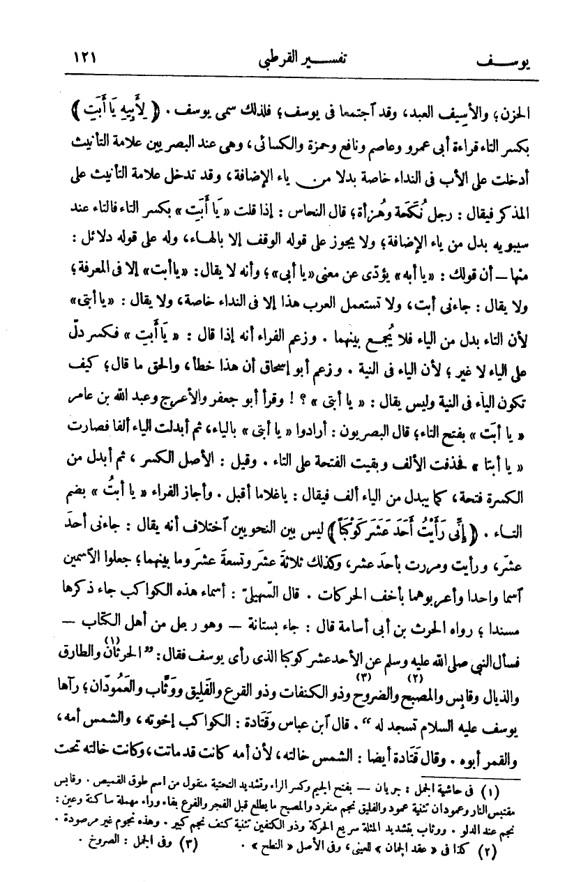 الْحُزْنُ، وَالْأَسِيفُ الْعَبْدُ، وَقَدِ اجْتَمَعَا فِي يُوسُفَ، فَلِذَلِكَ سُمِّيَ يُوسُفَ. (لِأَبِيهِ يَا أَبَتِ) بِكَسْرِ التَّاءِ قِرَاءَةُ أَبِي عَمْرٍو وَعَاصِمٍ وَنَافِعٍ وَحَمْزَةَ وَالْكِسَائِيِّ، وَهِيَ عِنْدَ الْبَصْرِيِّينَ عَلَامَةُ التَّأْنِيثِ أُدْخِلَتْ عَلَى الْأَبِ فِي النِّدَاءِ خَاصَّةً بَدَلًا مِنْ يَاءِ الْإِضَافَةِ، وَقَدْ تَدْخُلُ عَلَامَةُ التَّأْنِيثِ عَلَى الْمُذَكَّرِ فَيُقَالُ: رَجُلٌ نُكَحَةٌ وَهُزَأَةٌ، قَالَ النَّحَّاسُ: إِذَا قُلْتَ" يَا أَبَتِ" بِكَسْرِ التَّاءِ فَالتَّاءُ عِنْدَ سِيبَوَيْهِ بَدَلٌ مِنْ يَاءِ الْإِضَافَةِ، وَلَا يَجُوزُ عَلَى قَوْلِهِ الْوَقْفُ إِلَّا بِالْهَاءِ، وَلَهُ عَلَى قَوْلِهِ دَلَائِلُ: مِنْهَا- أَنَّ قَوْلَكَ:" يَا أَبَهْ" يُؤَدِّي عَنْ مَعْنَى" يَا أَبِي"، وَأَنَّهُ لَا يُقَالُ:" يَا أَبَتِ" إِلَّا فِي الْمَعْرِفَةِ، وَلَا يُقَالُ: جَاءَنِي أَبَتِ، وَلَا تَسْتَعْمِلُ الْعَرَبُ هَذَا إِلَّا فِي النِّدَاءِ خَاصَّةً، وَلَا يُقَالُ:" يَا أَبَتِي" لِأَنَّ التَّاءَ بَدَلٌ مِنَ الْيَاءِ فَلَا يُجْمَعُ بَيْنَهُمَا. وَزَعَمَ الْفَرَّاءُ أَنَّهُ إِذَا قَالَ:" يَا أَبَتِ" فَكَسَرَ دَلَّ عَلَى الْيَاءِ لَا غَيْرَ، لِأَنَّ الْيَاءَ فِي النِّيَّةِ. وَزَعَمَ أَبُو إِسْحَاقَ أَنَّ هَذَا خَطَأٌ، وَالْحَقُّ مَا قَالَ، كَيْفَ تَكُونُ الْيَاءُ فِي النِّيَّةِ وَلَيْسَ يُقَالُ:" يَا أَبَتِي"؟ وَقَرَأَ أَبُو جَعْفَرٍ وَالْأَعْرَجُ وَعَبْدُ اللَّهِ بْنُ عَامِرٍ" يَا أَبَتَ" بِفَتْحِ التَّاءِ، قَالَ الْبَصْرِيُّونَ: أَرَادُوا" يَا أَبَتِي" بِالْيَاءِ، ثُمَّ أُبْدِلَتِ الْيَاءُ أَلِفًا فَصَارَتْ" يَا أَبَتَا" فَحُذِفَتِ الْأَلِفُ وَبَقِيَتِ الْفَتْحَةُ عَلَى التَّاءِ. وَقِيلَ: الْأَصْلُ الْكَسْرُ، ثُمَّ أُبْدِلَ مِنَ الْكِسْرَةِ فَتْحَةٌ، كَمَا يُبْدَلُ مِنَ الْيَاءِ أَلِفٌ فَيُقَالُ: يَا غُلَامًا أَقْبِلْ. وَأَجَازَ الْفَرَّاءُ" يَا أَبَتُ" بِضَمِّ التَّاءِ. (إِنِّي رَأَيْتُ أَحَدَ عَشَرَ كَوْكَباً) لَيْسَ بَيْنَ النَّحْوِيِّينَ اخْتِلَافٌ أَنَّهُ يُقَالُ: جَاءَنِي أَحَدَ عَشَرَ، وَرَأَيْتُ وَمَرَرْتُ بِأَحَدَ عَشَرَ، وَكَذَلِكَ ثَلَاثَةَ عَشَرَ وَتِسْعَةَ عَشَرَ وَمَا بَيْنَهُمَا، جَعَلُوا الِاسْمَيْنِ اسْمًا وَاحِدًا وَأَعْرَبُوهُمَا بِأَخَفِّ الْحَرَكَاتِ. قَالَ السُّهَيْلِيُّ: أَسْمَاءُ هَذِهِ الْكَوَاكِبِ جَاءَ ذِكْرُهَا مُسْنَدًا، رَوَاهُ الْحَارِثُ بْنُ أَبِي أُسَامَةَ قَالَ: جَاءَ بُسْتَانَةُ- وَهُوَ رَجُلٌ مِنْ أَهْلِ الْكِتَابِ- فَسَأَلَ النَّبِيَّ صَلَّى اللَّهُ عَلَيْهِ وَسَلَّمَ عَنِ الْأَحَدَ عَشَرَ كَوْكَبًا الَّذِي رَأَى يُوسُفُ فَقَالَ:" الْحَرْثَانِ «١» وَالطَّارِقُ وَالذَّيَّالُ وَقَابِسٌ وَالْمُصْبِحُ «٢» وَالضَّرُوحُ «٣» وَذُو الْكَنَفَاتِ وَذُو الْقَرْعِ وَالْفَلِيقُ وَوَثَّابٌ وَالْعَمُودَانِ، رَآهَا يُوسُفُ عَلَيْهِ السَّلَامُ تَسْجُدُ لَهُ". قَالَ ابْنُ عَبَّاسٍ وَقَتَادَةُ: الْكَوَاكِبُ إِخْوَتُهُ، وَالشَّمْسُ أُمُّهُ، وَالْقَمَرُ أَبُوهُ. وَقَالَ قَتَادَةُ أَيْضًا: الشَّمْسُ خَالَتُهُ، لِأَنَّ أُمَّهُ كَانَتْ قد ماتت، وكانت خالته تحت
