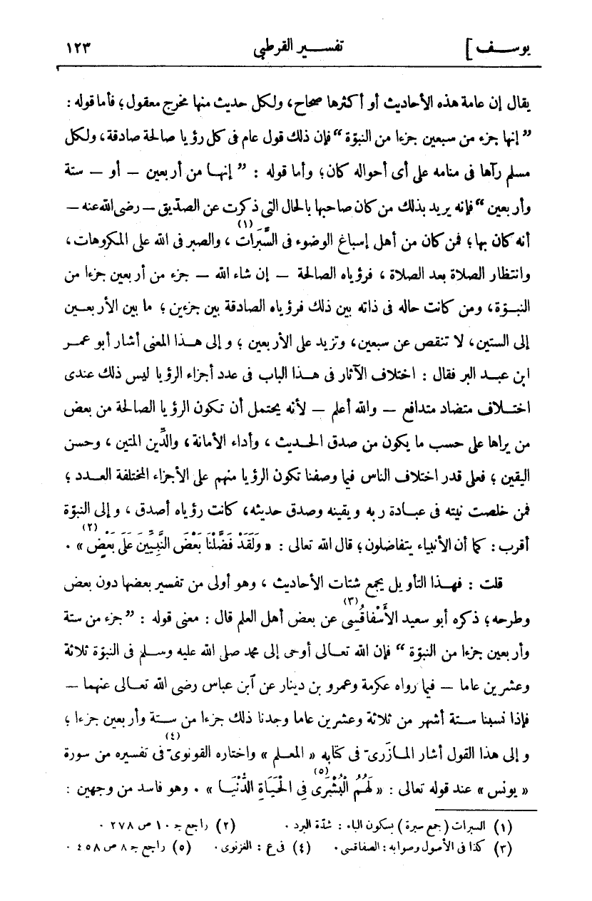 يُقَالَ إِنَّ عَامَّةَ هَذِهِ الْأَحَادِيثِ أَوْ أَكْثَرَهَا صِحَاحٌ، وَلِكُلِّ حَدِيثٍ مِنْهَا مَخْرَجٌ مَعْقُولٌ، فَأَمَّا قَوْلُهُ:" إِنَّهَا جُزْءٌ مِنْ سَبْعِينَ جُزْءًا مِنَ النُّبُوَّةِ" فَإِنَّ ذَلِكَ قَوْلٌ عَامٌّ فِي كُلِّ رُؤْيَا صَالِحَةٍ صَادِقَةٍ، وَلِكُلِّ مُسْلِمٍ رَآهَا فِي مَنَامِهِ عَلَى أَيِّ أَحْوَالِهِ كَانَ، وَأَمَّا قَوْلُهُ:" إنها من أربعين- أوستة وَأَرْبَعِينَ" فَإِنَّهُ يُرِيدُ بِذَلِكَ مَنْ كَانَ صَاحِبُهَا بِالْحَالِ الَّتِي ذَكَرْتُ عَنِ الصِّدِّيقِ- رَضِيَ اللَّهُ عَنْهُ- أَنَّهُ كَانَ بِهَا، فَمَنْ كَانَ مِنْ أَهْلِ إِسْبَاغِ الْوُضُوءِ فِي السَّبَرَاتِ «١»، وَالصَّبْرِ فِي اللَّهِ عَلَى الْمَكْرُوهَاتِ، وَانْتِظَارِ الصَّلَاةِ بَعْدَ الصَّلَاةِ، فرؤياه صالحة- إِنْ شَاءَ اللَّهُ- جُزْءٌ مِنْ أَرْبَعِينَ جُزْءًا مِنَ النُّبُوَّةِ، وَمَنْ كَانَتْ حَالُهُ فِي ذَاتِهِ بين ذلك فرؤياه الصادقة بين جزءين، ما بين الأربعين إلى الستين، ولا تَنْقُصُ عَنْ سَبْعِينَ، وَتَزِيدُ عَلَى الْأَرْبَعِينَ، وَإِلَى هذا المعنى أشار أبو عمر ابن عَبْدِ الْبَرِّ فَقَالَ: اخْتِلَافُ الْآثَارِ فِي هَذَا الْبَابِ فِي عَدَدِ أَجْزَاءِ الرُّؤْيَا لَيْسَ ذَلِكَ عندي اختلاف متضاد متدافع- وَاللَّهُ أَعْلَمُ- لِأَنَّهُ يَحْتَمِلُ أَنْ تَكُونَ الرُّؤْيَا الصَّالِحَةَ مِنْ بَعْضِ مَنْ يَرَاهَا عَلَى حَسَبِ مَا يَكُونُ مِنْ صِدْقِ الْحَدِيثِ، وَأَدَاءِ الْأَمَانَةِ، وَالدِّينِ الْمَتِينِ، وَحُسْنِ الْيَقِينِ، فَعَلَى قَدْرِ اخْتِلَافِ الناس فيما وصفناه تَكُونُ الرُّؤْيَا مِنْهُمْ عَلَى الْأَجْزَاءِ الْمُخْتَلِفَةِ الْعَدَدِ، فَمَنْ خَلَصَتْ نِيَّتُهُ فِي عِبَادَةِ رَبِّهِ وَيَقِينُهُ وَصَدَقَ حَدِيثُهُ، كَانَتْ رُؤْيَاهُ أَصْدَقَ، وَإِلَى النُّبُوَّةِ أَقْرَبَ: كَمَا أَنَّ الْأَنْبِيَاءُ يَتَفَاضَلُونَ، قَالَ اللَّهُ تَعَالَى:" وَلَقَدْ فَضَّلْنا بَعْضَ النَّبِيِّينَ عَلى بَعْضٍ «٢» ". قُلْتُ: فَهَذَا التَّأْوِيلُ يَجْمَعُ شَتَاتَ الْأَحَادِيثِ، وَهُوَ أولى من تفسير بعضها دون البعض وَطَرْحِهِ، ذَكَرَهُ أَبُو سَعِيدٍ الْأَسْفَاقُسِيُّ «٣» عَنْ بَعْضِ أَهْلِ الْعِلْمِ قَالَ: مَعْنَى قَوْلِهِ:" جُزْءٌ مِنْ سِتَّةٍ وَأَرْبَعِينَ جُزْءًا مِنَ النُّبُوَّةِ" فَإِنَّ اللَّهَ تَعَالَى أَوْحَى إِلَى مُحَمَّدٍ صَلَّى اللَّهُ عَلَيْهِ وَسَلَّمَ فِي النُّبُوَّةِ ثَلَاثَةً وَعِشْرِينَ عَامًا- فِيمَا رَوَاهُ عِكْرِمَةُ وَعَمْرُو بْنُ دِينَارٍ عَنِ ابْنِ عَبَّاسٍ رَضِيَ اللَّهُ تَعَالَى عَنْهُمَا- فَإِذَا نَسَبْنَا سِتَّةَ أَشْهُرٍ مِنْ ثَلَاثَةٍ وَعِشْرِينَ عَامًا وَجَدْنَا ذَلِكَ جُزْءًا مِنْ سِتَّةٍ وَأَرْبَعِينَ جُزْءًا، وَإِلَى هَذَا الْقَوْلِ أَشَارَ الْمَازِرِيُّ فِي كِتَابِهِ" الْمُعَلِّمِ" وَاخْتَارَهُ الْقُونَوِيُّ «٤» فِي تَفْسِيرِهِ مِنْ سُورَةِ" يُونُسَ" عند قوله تعالى:"هُمُ الْبُشْرى فِي الْحَياةِ الدُّنْيا