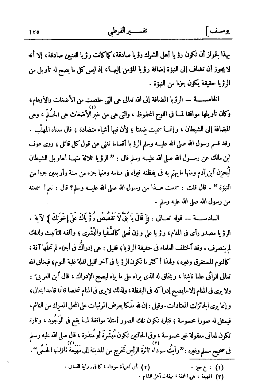 بِهَذَا لِجَوَازِ أَنْ تَكُونَ رُؤْيَا أَهْلِ الشِّرْكِ رُؤْيَا صَادِقَةً، كَمَا كَانَتْ رُؤْيَا الْفَتَيَيْنِ صَادِقَةً، إِلَّا أَنَّهُ لَا يَجُوزُ أَنْ تُضَافَ إِلَى النُّبُوَّةِ إِضَافَةَ رُؤْيَا الْمُؤْمِنِ إِلَيْهَا، إِذْ لَيْسَ كُلُّ مَا يَصِحُّ لَهُ تَأْوِيلٌ مِنَ الرُّؤْيَا حَقِيقَةً يَكُونُ جُزْءًا مِنَ النُّبُوَّةِ. الْخَامِسَةُ- الرُّؤْيَا المضافة إلى الله تعالى الَّتِي خَلَصَتْ مِنَ الْأَضْغَاثِ وَالْأَوْهَامِ، وَكَانَ تَأْوِيلُهَا مُوَافِقًا لِمَا فِي اللَّوْحِ الْمَحْفُوظِ، وَالَّتِي هِيَ مِنْ خَبَرِ «١» الْأَضْغَاثِ هِيَ الْحُلْمُ، وَهِيَ الْمُضَافَةُ إِلَى الشَّيْطَانِ، وَإِنَّمَا سُمِّيَتْ ضِغْثًا، لِأَنَّ فِيهَا أَشْيَاءَ مُتَضَادَّةً، قَالَ مَعْنَاهُ الْمُهَلَّبُ. وَقَدْ قَسَمَ رَسُولُ اللَّهِ صَلَّى اللَّهُ عَلَيْهِ وَسَلَّمَ الرُّؤْيَا أَقْسَامًا تُغْنِي عَنْ قَوْلِ كُلِّ قَائِلٍ، رَوَى عوف ابن مَالِكٍ عَنْ رَسُولِ اللَّهِ صَلَّى اللَّهُ عَلَيْهِ وَسَلَّمَ قَالَ:" الرُّؤْيَا ثَلَاثَةٌ مِنْهَا أَهَاوِيلُ الشَّيْطَانِ لِيُحْزِنَ ابْنَ آدَمَ وَمِنْهَا مَا يَهْتَمُّ بِهِ فِي يَقِظَتِهِ فَيَرَاهُ فِي مَنَامِهِ وَمِنْهَا جُزْءٌ مِنْ سِتَّةٍ وَأَرْبَعِينَ جُزْءًا مِنَ النُّبُوَّةِ،. قَالَ قُلْتُ: سَمِعْتَ هَذَا مِنْ رَسُولِ اللَّهِ صَلَّى اللَّهُ عَلَيْهِ وَسَلَّمَ؟ قَالَ نَعَمْ! سَمِعْتُهُ مِنْ رَسُولِ اللَّهِ صَلَّى اللَّهُ عَلَيْهِ وَسَلَّمَ. السَّادِسَةُ- قَوْلُهُ تَعَالَى: (قالَ يَا بُنَيَّ لَا تَقْصُصْ رُؤْياكَ عَلى إِخْوَتِكَ) الْآيَةَ. الرُّؤْيَا مَصْدَرُ رَأَى فِي الْمَنَامِ، رُؤْيَا عَلَى وَزْنِ فُعْلَى كَالسُّقْيَا وَالْبُشْرَى، وَأَلِفُهُ لِلتَّأْنِيثِ وَلِذَلِكَ لَمْ يَنْصَرِفْ. وَقَدِ اخْتَلَفَ الْعُلَمَاءُ فِي حَقِيقَةِ الرُّؤْيَا، فَقِيلَ: هِيَ إِدْرَاكٌ فِي أَجْزَاءٍ لَمْ تَحُلَّهَا آفَةٌ، كَالنَّوْمِ الْمُسْتَغْرِقِ وَغَيْرِهِ، وَلِهَذَا أَكْثَرُ مَا تَكُونُ الرُّؤْيَا فِي آخِرِ اللَّيْلِ لِقِلَّةِ غَلَبَةِ النَّوْمِ، فَيَخْلُقُ اللَّهُ تَعَالَى لِلرَّائِي عِلْمًا نَاشِئًا، وَيَخْلُقُ لَهُ الَّذِي يَرَاهُ عَلَى مَا يَرَاهُ لِيَصِحَّ الْإِدْرَاكُ، قَالَ ابْنُ الْعَرَبِيِّ: وَلَا يَرَى فِي الْمَنَامِ إِلَّا مَا يَصِحُّ إِدْرَاكُهُ فِي الْيَقِظَةِ، وَلِذَلِكَ لَا يَرَى فِي الْمَنَامِ شَخْصًا قَائِمًا قَاعِدًا بِحَالٍ، وَإِنَّمَا يَرَى الْجَائِزَاتِ الْمُعْتَادَاتِ. وَقِيلَ إِنَّ لِلَّهِ مَلَكًا يَعْرِضُ الْمَرْئِيَّاتِ عَلَى الْمَحَلِّ الْمُدْرِكِ مِنَ النَّائِمِ، فَيُمَثِّلُ لَهُ صُوَرًا مَحْسُوسَةً، فَتَارَةً تَكُونُ تِلْكَ الصُّوَرُ أَمْثِلَةً مُوَافِقَةً لِمَا يَقَعُ في الوجود، وتارة تكون لمعاني معقولة غير محسوسة، وفى الحالتين تكون مشرة أَوْ مُنْذِرَةً، قَالَ صَلَّى اللَّهُ عَلَيْهِ وَسَلَّمَ فِي صَحِيحِ مُسْلِمٍ وَغَيْرِهِ:" رَأَيْتُ سَوْدَاءَ «٢» ثَائِرَةَ الرَّأْسِ تَخْرُجُ مِنَ الْمَدِينَةِ إِلَى مَهْيَعَةٍ «٣» فَأَوَّلْتُهَا الحمى".