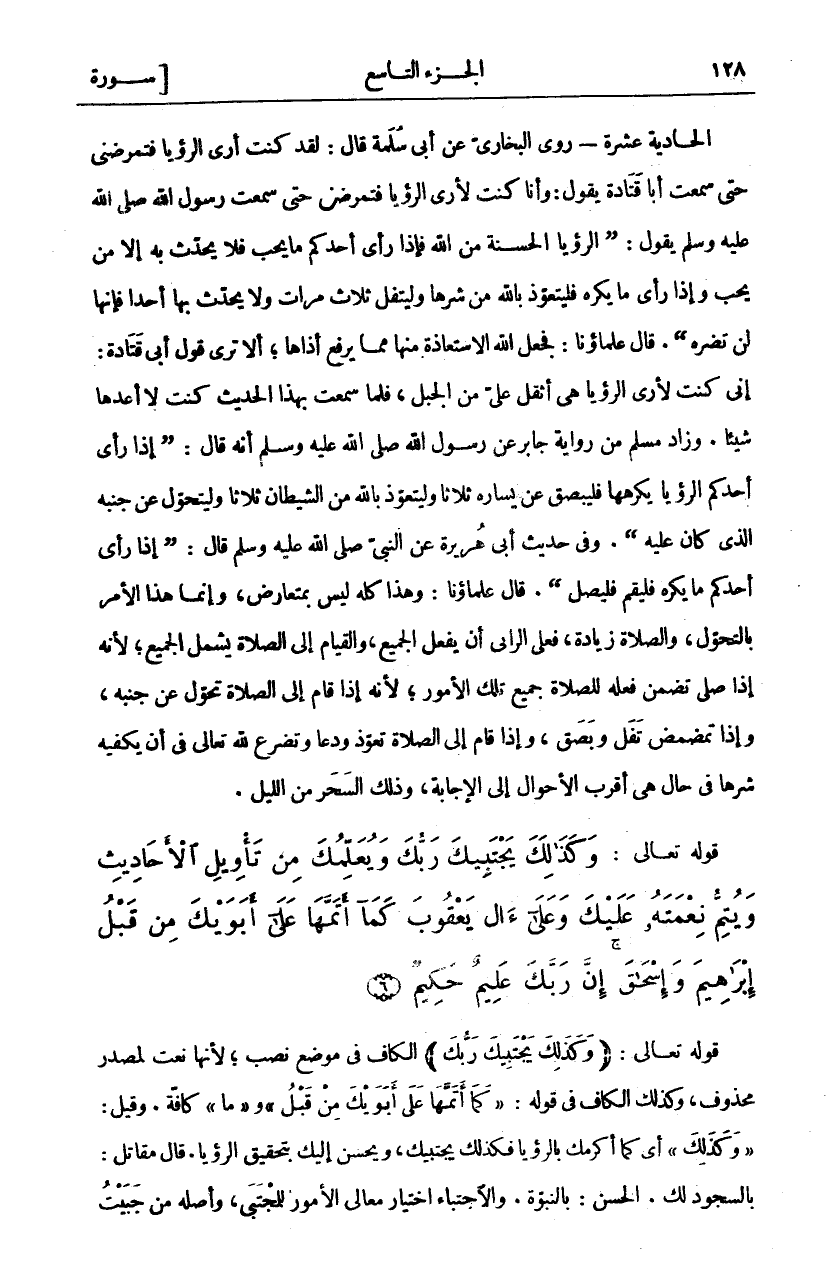 الحادية عشر- رَوَى الْبُخَارِيُّ عَنْ أَبِي سَلَمَةَ قَالَ: لَقَدْ كُنْتُ أَرَى الرُّؤْيَا فَتُمْرِضُنِي حَتَّى سَمِعْتُ أَبَا قَتَادَةَ يَقُولُ: وَأَنَا كُنْتُ لَأَرَى الرُّؤْيَا فَتُمْرِضُنِي حَتَّى سَمِعْتُ رَسُولَ اللَّهِ صَلَّى اللَّهُ عَلَيْهِ وَسَلَّمَ يَقُولُ:" الرُّؤْيَا الْحَسَنَةُ مِنَ اللَّهِ فَإِذَا رَأَى أَحَدُكُمْ مَا يُحِبُّ فَلَا يُحَدِّثُ بِهِ إِلَّا مَنْ يُحِبُّ وَإِذَا رَأَى مَا يَكْرَهُ فَلْيَتَعَوَّذْ بِاللَّهِ مِنْ شَرِّهَا وَلْيَتْفُلْ ثَلَاثَ مَرَّاتٍ وَلَا يُحَدِّثْ بِهَا أَحَدًا فَإِنَّهَا لَنْ تَضُرَّهُ". قَالَ عُلَمَاؤُنَا: فَجَعَلَ اللَّهُ الِاسْتِعَاذَةَ مِنْهَا مِمَّا يَرْفَعُ أَذَاهَا، أَلَا تَرَى قَوْلَ أَبِي قَتَادَةَ: إِنِّي كُنْتُ لَأَرَى الرُّؤْيَا هِيَ أَثْقَلُ عَلَيَّ مِنَ الْجَبَلِ، فَلَمَّا سَمِعْتُ بِهَذَا الْحَدِيثِ كُنْتُ لَا أَعُدُّهَا شَيْئًا. وَزَادَ مُسْلِمٌ مِنْ رِوَايَةِ جَابِرٍ عَنْ رَسُولِ اللَّهِ صَلَّى اللَّهُ عَلَيْهِ وَسَلَّمَ أَنَّهُ قَالَ:" إِذَا رَأَى أَحَدُكُمُ الرُّؤْيَا يَكْرَهُهَا فَلْيَبْصُقْ عَنْ يَسَارِهِ ثَلَاثًا وَلْيَتَعَوَّذْ بِاللَّهِ مِنَ الشَّيْطَانِ ثَلَاثًا وَلْيَتَحَوَّلْ عَنْ جَنْبِهِ الَّذِي كَانَ عَلَيْهِ". وَفِي حَدِيثُ أَبِي هُرَيْرَةَ عَنِ النَّبِيِّ صَلَّى اللَّهُ عَلَيْهِ وَسَلَّمَ قال:" إذا رَأَى أَحَدُكُمْ مَا يَكْرَهُ فَلْيَقُمْ فَلْيُصَلِّ". قَالَ عُلَمَاؤُنَا: وَهَذَا كُلُّهُ لَيْسَ بِمُتَعَارِضٍ، وَإِنَّمَا هَذَا الْأَمْرُ بِالتَّحَوُّلِ، وَالصَّلَاةِ زِيَادَةٌ، فَعَلَى الرَّائِي أَنْ يَفْعَلَ الْجَمِيعَ، وَالْقِيَامُ إِلَى الصَّلَاةِ يَشْمَلُ الْجَمِيعَ، لِأَنَّهُ إِذَا صَلَّى تَضَمَّنَ فِعْلُهُ لِلصَّلَاةِ جَمِيعَ تِلْكَ الْأُمُورِ، لِأَنَّهُ إِذَا قَامَ إِلَى الصَّلَاةِ تَحَوَّلَ عَنْ جَنْبِهِ، وَإِذَا تَمَضْمَضَ تَفَلَ وَبَصَقَ، وَإِذَا قَامَ إِلَى الصَّلَاةِ تَعَوَّذَ وَدَعَا وَتَضَرَّعَ لِلَّهِ تَعَالَى فِي أَنْ يَكْفِيَهُ شَرَّهَا فِي حَالٍ هِيَ أَقْرَبُ الْأَحْوَالِ إِلَى الْإِجَابَةِ، وَذَلِكَ السحر من الليل.