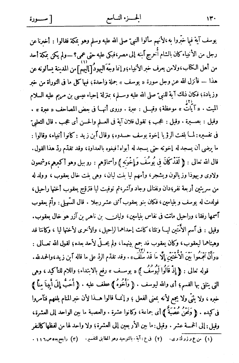 يُوسُفَ آيَةٌ فِيمَا خُبِّرُوا بِهِ، لِأَنَّهُمْ سَأَلُوا النَّبِيَّ صَلَّى اللَّهُ عَلَيْهِ وَسَلَّمَ وَهُوَ بِمَكَّةَ فَقَالُوا: أَخْبِرْنَا عَنْ رَجُلٍ مِنَ الْأَنْبِيَاءِ كَانَ بِالشَّامِ أُخْرِجَ ابْنُهُ إِلَى مِصْرَ، فَبَكَى عَلَيْهِ حَتَّى عَمِيَ؟ - وَلَمْ يَكُنْ بِمَكَّةَ أَحَدٌ مِنْ أَهْلِ الْكِتَابِ، وَلَا مَنْ يَعْرِفُ خَبَرَ الْأَنْبِيَاءِ، وَإِنَّمَا وَجَّهَ الْيَهُودُ [إِلَيْهِمْ] «١» مِنَ الْمَدِينَةِ يَسْأَلُونَهُ عَنْ هَذَا- فَأَنْزَلَ اللَّهُ عَزَّ وَجَلَّ سُورَةَ" يُوسُفَ" جُمْلَةً وَاحِدَةً، فِيهَا كُلُّ مَا فِي التَّوْرَاةِ مِنْ خَبَرٍ وَزِيَادَةٍ، فَكَانَ ذَلِكَ آيَةً لِلنَّبِيِّ صَلَّى اللَّهُ عَلَيْهِ وَسَلَّمَ، بِمَنْزِلَةِ إِحْيَاءِ عِيسَى ابْنِ مَرْيَمَ عَلَيْهِ السَّلَامُ الْمَيِّتَ." آياتٌ" «٢» مَوْعِظَةٍ، وَقِيلَ: عِبْرَةٌ. وَرُوِيَ أَنَّهَا فِي بَعْضِ الْمَصَاحِفِ" عِبْرَةٌ". وَقِيلَ: بَصِيرَةٌ. وَقِيلَ: عَجَبٌ، تَقُولُ فُلَانٌ آيَةٌ فِي الْعِلْمِ وَالْحُسْنِ أَيْ عَجَبٌ. قَالَ الثَّعْلَبِيُّ فِي تَفْسِيرِهِ: لَمَّا بَلَغَتِ الرُّؤْيَا إِخْوَةُ يُوسُفَ حَسَدُوهُ، وَقَالَ ابْنُ زَيْدٍ: كَانُوا أَنْبِيَاءَ، وَقَالُوا: مَا يَرْضَى أَنْ يَسْجُدَ لَهُ إِخْوَتُهُ حَتَّى يَسْجُدَ لَهُ أَبَوَاهُ! فَبَغَوْهُ بِالْعَدَاوَةِ، وَقَدْ تَقَدَّمَ رَدُّ هَذَا الْقَوْلِ. قَالَ اللَّهُ تَعَالَى: (لَقَدْ كانَ فِي يُوسُفَ وَإِخْوَتِهِ) وَأَسْمَاؤُهُمْ: رُوبِيلُ وَهُوَ أَكْبَرُهُمْ، وَشَمْعُونُ وَلَاوِي وَيَهُوذَا وزيالون ويشجر، وَأُمُّهُمْ ليا بِنْتُ ليان، وَهِيَ بِنْتُ خَالِ يَعْقُوبَ، وَوُلِدَ لَهُ مِنْ سُرِّيَّتَيْنِ أَرْبَعَةُ نَفَرٍ، دان ونفتالي وجاد وآشر، ثُمَّ تُوُفِّيَتْ ليا فَتَزَوَّجَ يَعْقُوبُ أُخْتَهَا رَاحِيلَ، فَوَلَدَتْ لَهُ يُوسُفَ وَبِنْيَامِينَ، فَكَانَ بَنُو يَعْقُوبَ اثْنَيْ عَشَرَ رَجُلًا. قَالَ السُّهَيْلِيُّ: وَأُمُّ يَعْقُوبَ اسْمُهَا رفقا، وَرَاحِيلُ مَاتَتْ فِي نِفَاسِ بِنْيَامِينَ، وليان بْنُ نَاهِرَ بْنِ آزَرَ هُوَ خَالُ يَعْقُوبَ. وَقِيلَ: فِي اسْمِ الْأَمَتَيْنِ ليا وتلتا، كَانَتْ إِحْدَاهُمَا لراحيل، والأخرى لأختها ليا، وكانتا قد وهبناهما لِيَعْقُوبَ، وَكَانَ يَعْقُوبُ قَدْ جَمَعَ بَيْنَهُمَا، وَلَمْ يَحِلَّ لِأَحَدٍ بَعْدَهُ، لِقَوْلِ اللَّهِ تَعَالَى:" وَأَنْ تَجْمَعُوا بَيْنَ الْأُخْتَيْنِ إِلَّا مَا قَدْ سَلَفَ" «٣» [النساء: ٢٣]. وَقَدْ تَقَدَّمَ الرَّدُّ عَلَى مَا قَالَهُ ابْنُ زَيْدٍ، وَالْحَمْدُ لِلَّهِ. قَوْلُهُ تَعَالَى: (إِذْ قالُوا لَيُوسُفُ) " لَيُوسُفُ" رُفِعَ بِالِابْتِدَاءِ، وَاللَّامُ لِلتَّأْكِيدِ، وَهِيَ الَّتِي يُتَلَقَّى بِهَا الْقَسَمُ، أَيْ وَاللَّهِ لَيُوسُفُ. (وَأَخُوهُ) عَطْفٌ عَلَيْهِ. (أَحَبُّ إِلى أَبِينا مِنَّا) خَبَرُهُ، وَلَا يُثَنَّى وَلَا يُجْمَعُ لِأَنَّهُ بِمَعْنَى الْفِعْلِ، وَإِنَّمَا قَالُوا هَذَا لِأَنَّ خَبَرَ الْمَنَامِ بَلَغَهُمْ فَتَآمَرُوا فِي كَيْدِهِ. (وَنَحْنُ عُصْبَةٌ) أَيْ جَمَاعَةٌ، وَكَانُوا عَشَرَةً. وَالْعُصْبَةُ مَا بَيْنَ الْوَاحِدِ إِلَى الْعَشَرَةِ، وَقِيلَ: إِلَى الْخَمْسَةَ عَشَرَ. وَقِيلَ: مَا بَيْنَ الْأَرْبَعِينَ إِلَى الْعَشَرَةِ، وَلَا وَاحِدَ لَهَا مِنْ لفظها كالنفر