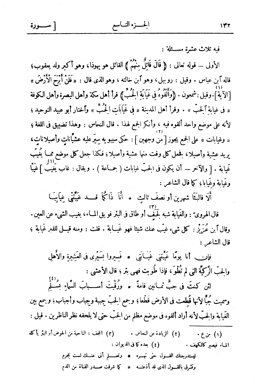 فيه ثلاث عشر مَسْأَلَةً: الْأُولَى- قَوْلُهُ تَعَالَى: (قالَ قائِلٌ مِنْهُمْ) الْقَائِلُ هُوَ يَهُوذَا، وَهُوَ أَكْبَرُ وَلَدِ يَعْقُوبَ، قَالَهُ ابْنُ عَبَّاسٍ. وَقِيلَ: رُوبِيلُ، وَهُوَ ابْنُ خَالَتِهِ، وَهُوَ الَّذِي قَالَ:" فَلَنْ أَبْرَحَ الْأَرْضَ" [يوسف: ٨٠] [الآية «١»]. وقيل: شمعون. (وَأَلْقُوهُ فِي غَيابَتِ الْجُبِّ) قَرَأَ أَهْلُ مَكَّةَ وَأَهْلُ الْبَصْرَةِ وَأَهْلُ الكوفة" فِي غَيابَتِ الْجُبِّ". وَقَرَأَ أَهْلُ الْمَدِينَةِ" فِي غَيَابَاتِ الْجُبِّ" وَاخْتَارَ أَبُو عُبَيْدٍ التَّوْحِيدَ، لِأَنَّهُ عَلَى مَوْضِعٍ واحد ألقوه فيه، وأنكر الجمح لِهَذَا. قَالَ النَّحَّاسُ: وَهَذَا تَضْيِيقٌ فِي اللُّغَةِ،" وَغَيَابَاتٌ" عَلَى الْجَمْعِ يَجُوزُ [مِنْ وَجْهَيْنِ] «٢»: حَكَى سِيبَوَيْهِ سِيرَ عَلَيْهِ عَشِيَّانَاتٍ وَأَصِيلَانَاتٍ، يُرِيدُ عَشِيَّةً وَأَصِيلًا، فَجَعَلَ كُلَّ وَقْتٍ مِنْهَا عَشِيَّةً وَأَصِيلًا، فَكَذَا جَعَلَ كُلَّ مَوْضِعٍ مِمَّا يَغِيبُ غَيَابَةً. [وَالْآخَرُ- أَنْ يَكُونَ فِي الْجُبِّ غَيَابَاتٌ (جَمَاعَةٌ). وَيُقَالُ: غَابَ يَغِيبُ [غَيْبًا وَغَيَابَةً وَغِيَابًا، كَمَا قَالَ الشَّاعِرُ:
