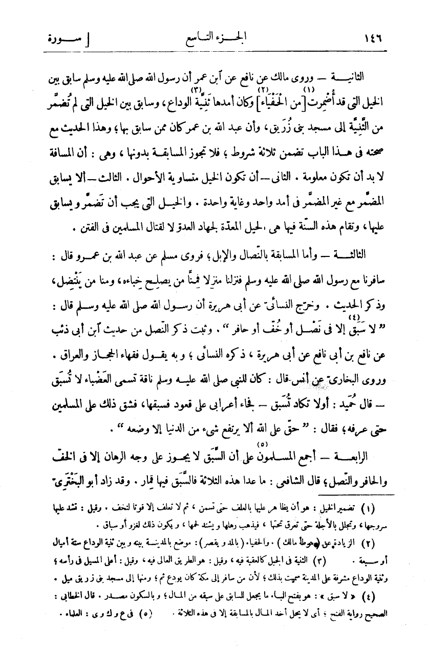 الثَّانِيَةُ: وَرَوَى مَالِكٍ عَنْ نَافِعٍ عَنِ ابْنِ عُمَرَ أَنَّ رَسُولَ اللَّهِ صَلَّى اللَّهُ عَلَيْهِ وَسَلَّمَ سَابَقَ بَيْنَ الْخَيْلِ الَّتِي قَدْ أُضْمِرَتْ «١» [مِنَ الْحَفْيَاءِ «٢»] وَكَانَ أَمَدُهَا ثَنِيَّةَ «٣» الْوَدَاعِ، وَسَابَقَ بَيْنَ الْخَيْلِ الَّتِي لَمْ تُضَمَّرْ مِنَ الثَّنِيَّةِ إِلَى مَسْجِدِ بَنِي زُرَيْقٍ، وَأَنَّ عَبْدَ اللَّهِ بْنَ عُمَرَ كَانَ مِمَّنْ سَابَقَ بِهَا، وَهَذَا الْحَدِيثُ مَعَ صِحَّتِهِ فِي هَذَا الْبَابِ تَضَمَّنَ ثَلَاثَةَ شُرُوطٍ، فَلَا تَجُوزُ الْمُسَابَقَةُ بِدُونِهَا، وَهِيَ: أَنَّ الْمَسَافَةَ لَا بُدَّ أَنْ تَكُونَ مَعْلُومَةً. الثَّانِي- أَنْ تَكُونَ الْخَيْلُ مُتَسَاوِيَةَ الْأَحْوَالِ. الثَّالِثُ- أَلَّا يُسَابِقَ الْمُضَمَّرُ مَعَ غَيْرِ الْمُضَمَّرِ فِي أَمَدٍ وَاحِدٍ وَغَايَةٍ وَاحِدَةٍ. وَالْخَيْلُ الَّتِي يَجِبُ أَنْ تُضَمَّرَ وَيُسَابَقُ عَلَيْهَا، وَتُقَامُ هَذِهِ السُّنَّةُ فِيهَا هِيَ الْخَيْلُ الْمُعَدَّةُ لِجِهَادِ الْعَدُوِّ لَا لِقِتَالِ الْمُسْلِمِينَ فِي الْفِتَنِ. الثَّالِثَةُ- وَأَمَّا الْمُسَابَقَةُ بِالنِّصَالِ وَالْإِبِلِ، فَرَوَى مُسْلِمٍ عَنْ عَبْدِ اللَّهِ بْنِ عَمْرٍو قَالَ: سَافَرْنَا مَعَ رَسُولِ اللَّهِ صَلَّى اللَّهُ عَلَيْهِ وَسَلَّمَ فَنَزَلْنَا مَنْزِلًا فَمِنَّا مَنْ يُصْلِحُ خِبَاءَهُ، وَمِنَّا مَنْ يَنْتَضِلُ، وَذَكَرَ الْحَدِيثَ. وَخَرَّجَ النَّسَائِيُّ عَنْ أَبِي هُرَيْرَةَ أَنَّ رَسُولَ اللَّهِ صَلَّى اللَّهُ عَلَيْهِ وَسَلَّمَ قال:" لَا سَبَقَ «٤» إِلَّا فِي نَصْلٍ أَوْ خُفٍّ أَوْ حَافِرٍ". وَثَبَتَ ذِكْرُ النَّصْلِ مِنْ حَدِيثِ ابْنِ أَبِي ذِئْبٍ عَنْ نَافِعِ بْنِ أَبِي نَافِعٍ عَنْ أَبِي هُرَيْرَةَ، ذَكَرَهُ النَّسَائِيُّ، وَبِهِ يَقُولُ فُقَهَاءَ الْحِجَازُ وَالْعِرَاقُ. وَرَوَى الْبُخَارِيُّ عَنْ أَنَسٍ قَالَ: كَانَ لِلنَّبِيِّ صَلَّى اللَّهُ عَلَيْهِ وَسَلَّمَ نَاقَةٌ تُسَمَّى الْعَضْبَاءُ لَا تُسْبَقُ- قَالَ حميد: أولا تَكَادُ تُسْبَقُ- فَجَاءَ أَعْرَابِيٌّ عَلَى قَعُودٍ فَسَبَقَهَا، فَشَقَّ ذَلِكَ عَلَى الْمُسْلِمِينَ حَتَّى عَرَفَهُ، فَقَالَ:" حق على الله ألا يرتفع شي مِنَ الدُّنْيَا إِلَّا وَضَعَهُ". الرَّابِعَةُ- أَجْمَعَ الْمُسْلِمُونَ «٥» عَلَى أَنَّ السَّبَقَ لَا يَجُوزُ عَلَى وَجْهِ الرِّهَانِ إِلَّا فِي الْخُفِّ وَالْحَافِرِ وَالنَّصْلِ، قَالَ الشَّافِعِيُّ: مَا عَدَا هَذِهِ الثَّلَاثَةِ فَالسَّبَقُ فِيهَا قمار. وقد زاد أبو البختري